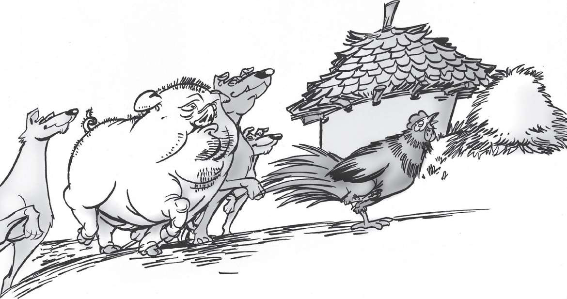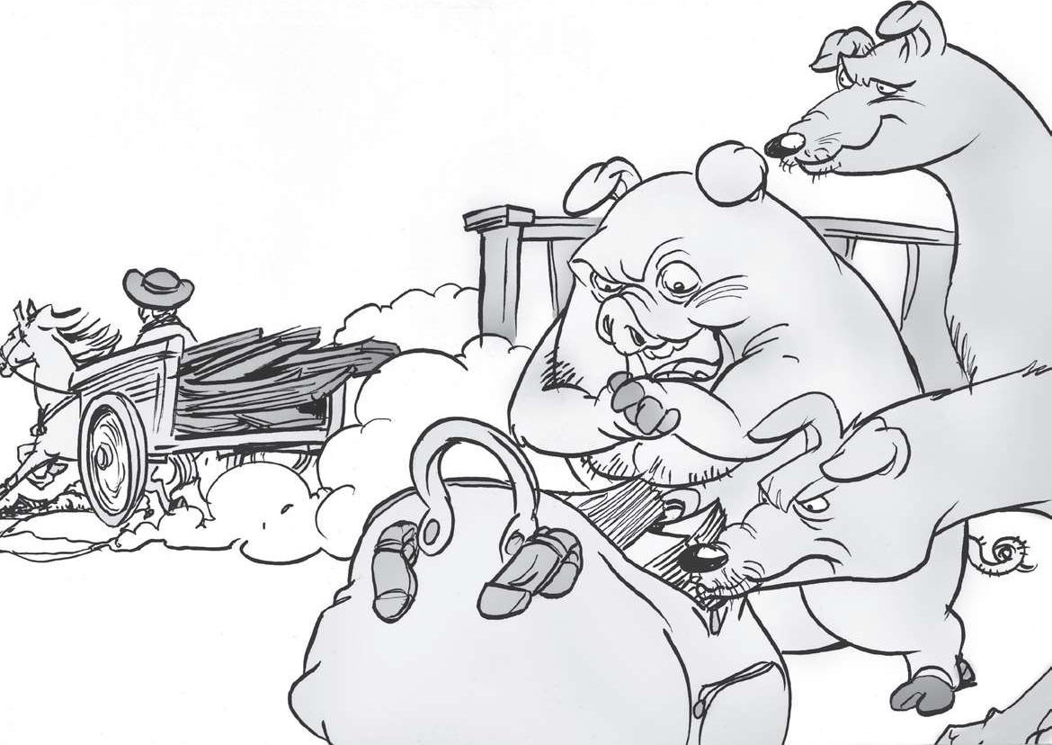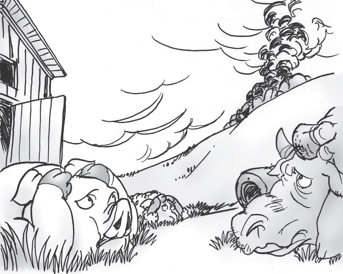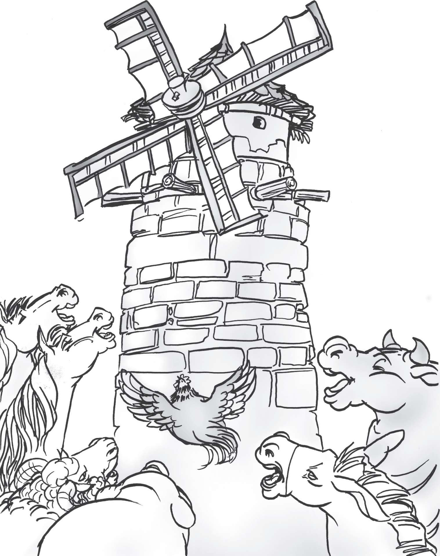 与此同时,弗雷德里克一帮人已在风车周围停了下来。动物们一边注视着他们,一边惊慌绝望地小声议论起来。他们中间的两个人拿出一根钢钎和一把大铁锤。他们准备砸毁风车。