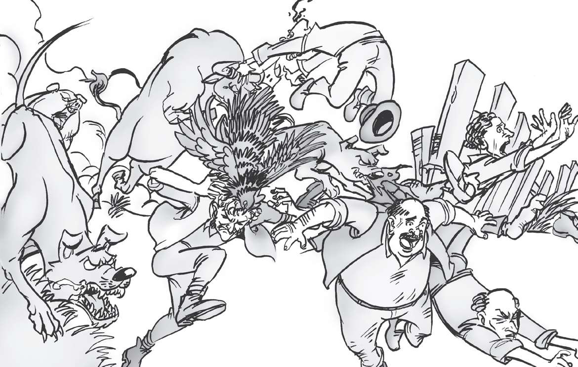 看到这幅画面,动物们又重新鼓起了勇气。他们在片刻之前所感到的胆怯和绝望,此时已淹没在由这种可耻卑鄙的行为所激起的狂怒之中。一阵有力的复仇呐喊猛然响起,动物们来不及等下一步的命令,便全体径直扑向敌人。这一次,他们顾不上理会那些犹如冰雹一般无情的子弹在他们头上呼啸而过。这是一场残酷、惨烈的战斗。那帮人一直不停地开枪,等到动物们与他们距离很近时,他们就舞动棍棒乱打,抬起沉重的靴子猛踢。一头牛、三只羊以及两只鹅惨遭杀害,差不多每一个动物都受了伤。就连一直在后方指挥作战的拿破仑,尾巴尖也被子弹削去了一小块。但那些人也并非安然无恙。其中三个人的头被拳师的蹄子踢破;另一个人的腹部被一头牛的犄角抵破;还有一个人,裤子差点被杰西和蓝铃铛扯掉。作为拿破仑贴身侍卫的那九条狗,奉命在树篱的遮掩下迂回包抄,突然出现在敌人的侧翼,气势汹汹地狂吠起来,把那帮人吓得魂飞魄散。他们发觉自己有被包围的危险,弗雷德里克趁退路还在就大喊他的同伙撤离。不到一会儿,那些贪生怕死的敌人便纷纷逃命了。动物们把他们一直追到地界边上,而且在他们从那片荆棘树篱中夺路而逃时,动物们还踢了他们最后几脚。