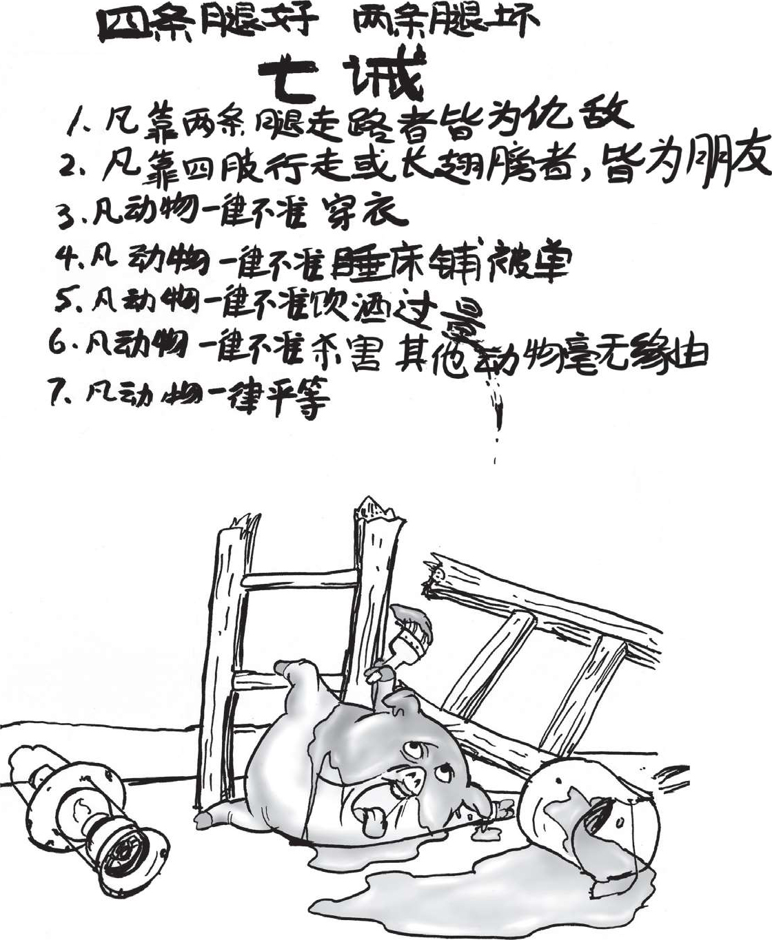 但是没过几天,穆丽尔在给自己读七诫时,注意到其中还有另外一条戒律动物们也都记错了,他们原本认为第五条戒律是“凡动物一律不准饮酒”,但他们都忘了那儿还有两个字,那条戒律实际上是这样的:“凡动物一律不准饮酒过量”。