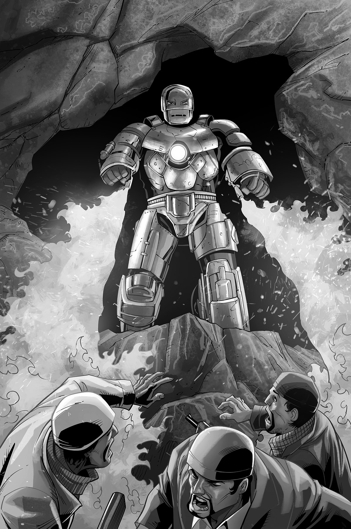 The tunnel opened up into a wide cavern, the main chamber of the complex. The exit beckoned on the other side, but between it and Tony stood a dozen of Raza’s men. Yinsen lay crumpled on the ground near the exit, wounded.