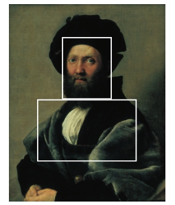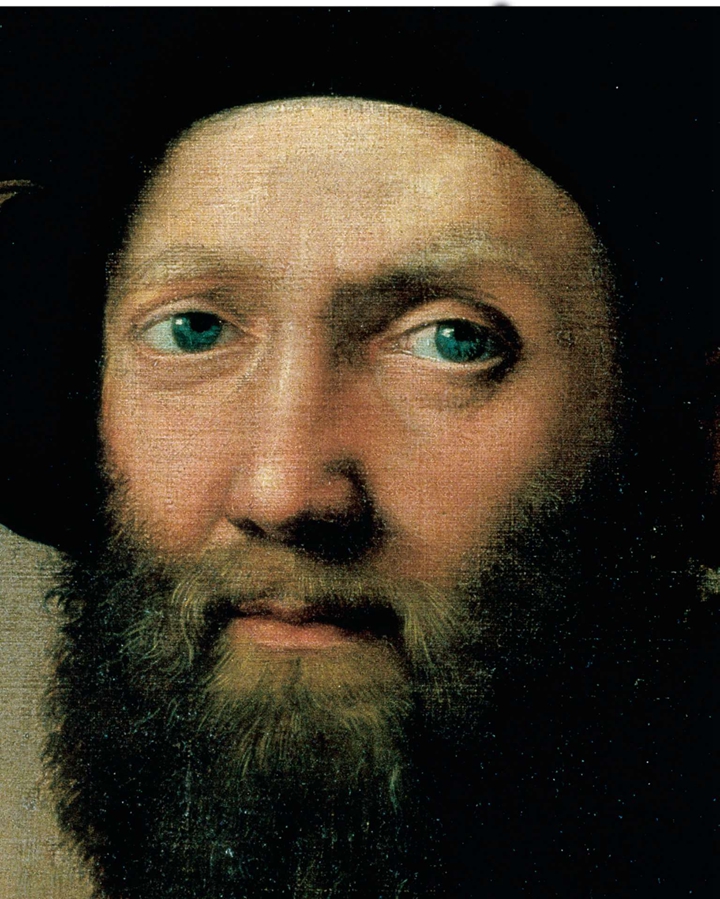 这个男人坐在我们面前,看起来冷静可靠。 他的肖像甚至可能逃离我们的注意,似乎要跟它周围的世界融合在一起。男人打动我们的,是他给我们的熟悉感,可我们甚至还从未遇到过巴尔达萨雷·卡斯蒂利奥内。拉斐尔谨慎地把他展现到我们面前,一半处于阴影中。也许更准确地说,是他把我们展现给了这个男人,因为他的眼神毫不退缩,让我们清楚地知道:是他在看着我们,自如,随意,从容不迫。
