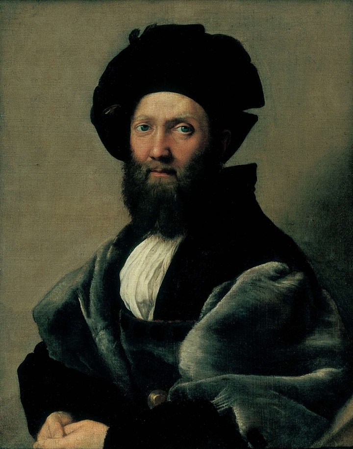 巴尔达萨雷·卡斯蒂利奥内是拉斐尔的朋友,也是乌尔比诺在罗马的大使, 但是他的这幅肖像画对地位和权力没有任何展示,表现出模特儿的内敛。他坐在没有变化的背景前,身着灰色和黑色的衣服。他的白色衬衫好似一个发光的“原子核”,在画的中心。他的表情表现得异常清醒和节制,这样一幅色调单一的画,几乎要把我们推到一边。但它又足以让我们靠得更近,去仔细观察肖像画中更清晰的细节,去发现微妙的光亮、细碎的反光和质地上的细微差别;我们之前都没有意识到这些。我们注意到:如果把衬衫的白放在一边,他的紧身上衣的黑色要更打动人,在灰色毛皮旁边,那黑色变得更深了。它的严肃被天鹅绒的光滑所缓和。看着他的额头上的细纹,我们可以想象那有多柔软。他胸前的衬衫有褶皱,体现出一股纠缠的力量,让画面的中心产生活力。相对于毛皮的柔软和丰厚,这力量更为突出和强烈。