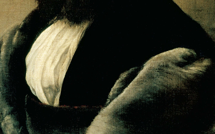 拉斐尔当然可以用悦目的光表现丝绸炫目的光泽, 让人想起绸缎娑娑的声响,这还更简单。但巴尔达萨雷·卡斯蒂利奥内对出风头不感兴趣。尽管价格高昂,天鹅绒和毛皮能够非常好地吸收光线,将光线隐藏在模特儿衣服的厚重之中,如同严格保守的秘密。在他贝雷帽的边上,一根细小的羽毛若隐若现。一些反光浮动在他的衣袖上方,似乎有些极为细小的毛皮摩擦声音正在消失,很快就听不到了。肖像的冷静是可以传染的。在大使周围,世界的进程没有那么焦躁。克制,是人类庄严的一种表现。