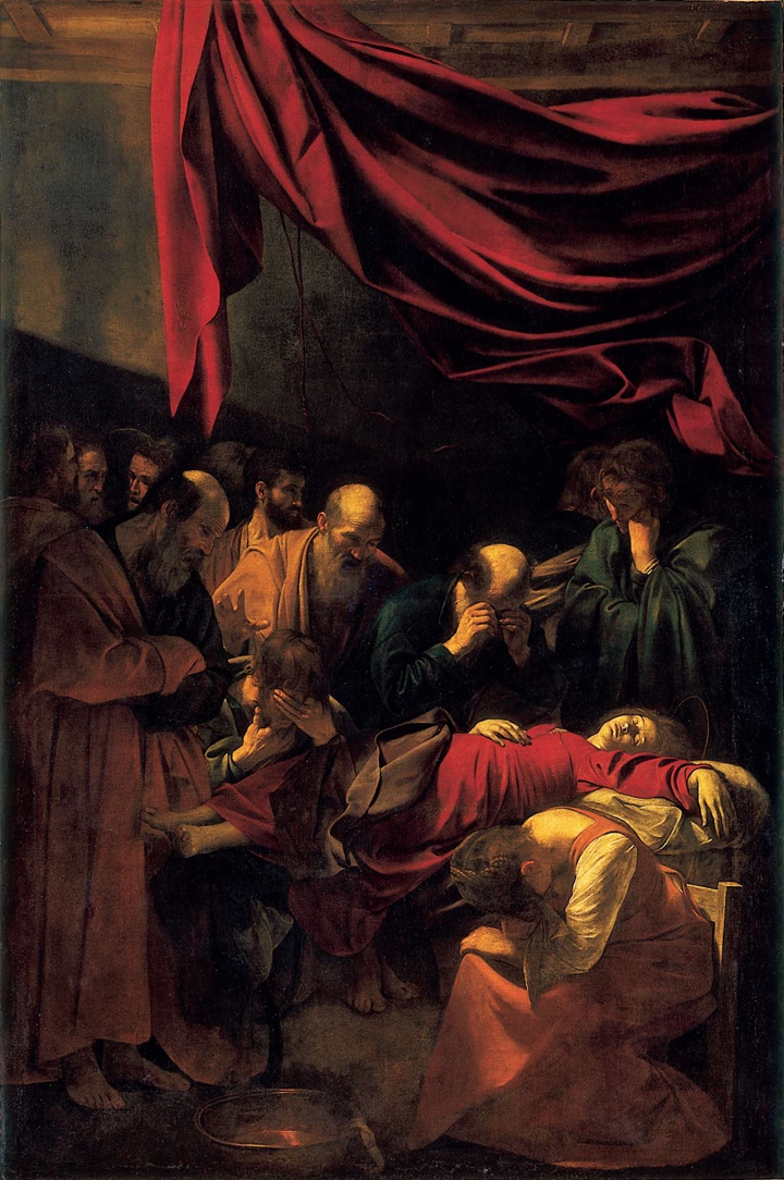 圣母马利亚躺在桌子上,岁月在她的脸上留下皱纹。衣裙掀起来一部分,露出脚踝。一条毯子匆忙搭在她身上。赏画者由此看出:这是某种事故的场景,她并非安详死去。似乎哀悼者们必须临时想办法,把尸身安顿好,因为不能让她躺在地上。这个场景如此真实,实际上太过真实。在1607年,神职人员们甚至不敢看这幅画:这些门徒的惊愕从何而来?那受胎告知的天使的善良何在?圣母马利亚死前的默念和祈祷呢?那些把门徒带到圣母马利亚面前而且要把圣母马利亚送上天堂的云彩哪里去了?卡拉瓦乔本该将这个时刻诠释为向天堂的过渡,充满喜乐,而不是生命终结本身。但他没有展示给我们这些,他也没有画出基督。按照惯例,在这类画中,基督本该手里抱着以儿童面目出现的东西,实际上那是他母亲的灵魂,不久后,这灵魂就会受到天国的欢迎。