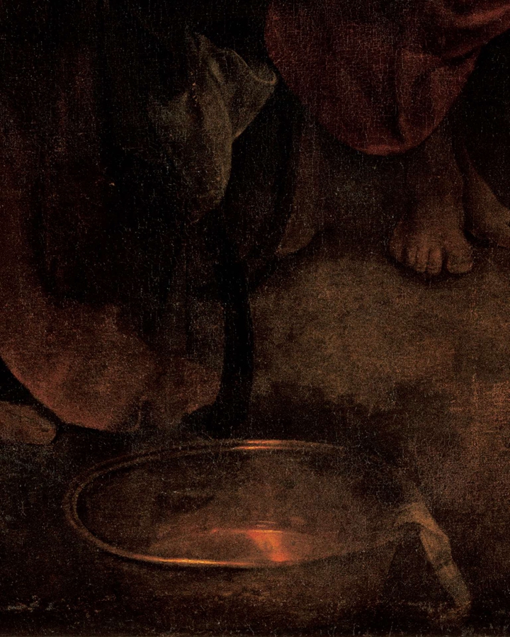 一个年轻女子坐得离我们很近,低头哭泣,脸埋在手里面。 然而,尽管她的痛苦十分真切,但最先打动赏画者的,却是她明亮的脖颈、褐色的头发,还有她琥珀色衣服发出的光辉。在所有的悲哀中,她的美丽似乎有些不协调,有点不合时宜。我们的眼睛停留在她身上,找到一些慰藉。我们允许自己忘记,但是不能太久。大铜盆召回这乏味的现实。它挡住了我们的去路:几乎要把我们绊倒。沉思的时刻结束了,尸身需要摆放整齐。前面这个年轻女子知道应该做什么。