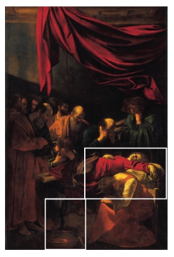 圣母马利亚的脸,光打在上面,是我们唯一能完全看清的脸,而其他人的脸以不同方式被阴影遮挡,告诉我们:他们还是这尘世的一部分。然后就是她的衣服,掉落在桌子边缘,在华丽的幕帘下方。即将被遗弃的破烂衣服与它上面的华贵幕布,二者之间的对比,象征穷困与庄严,死亡与展开(déploiement)。幕布,这剧场中不起眼的道具,现在突然承担了异常重要的责任,因为在它和圣母马利亚的身体之间,卡拉瓦乔建立起一种权威性的平行关系。