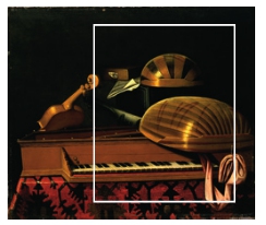 前面这个比较大的诗琴起主导作用。 维金纳琴几乎同等重要,它是整个构图的基础。没了它,似乎整个画面就没有根了。当然,维金纳琴和诗琴主导整幅画,情节围绕着它俩展开:它们的相遇构成了音乐会。乐谱放得不远,就在大黑盒子上,盒子上面放着小诗琴。一本厚厚的书,也许是《圣经》,防止乐谱滑下来,或是被吹走。在书页之间,一片纸放在那里,如同一张书签:看书的人也许是读到这里停了下来,也许是希望标注出某个选定的篇章。