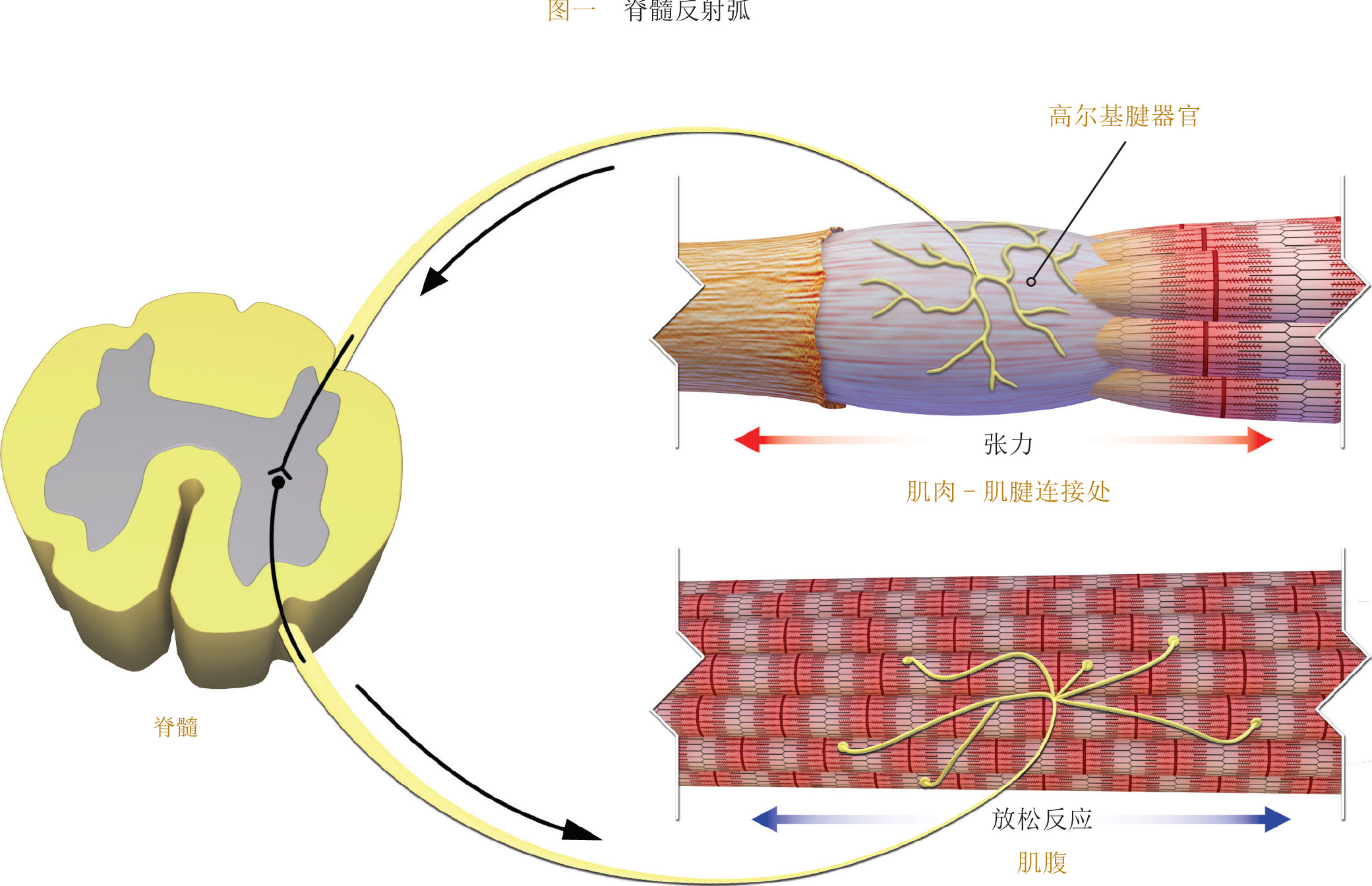 图一 在了解共同启动原理后,接下来就是试着收缩想要伸展的那条肌肉。我们利用离心收缩来增加肌肉的长度,这项技巧就称为诱发式伸展。诱发式伸展利用了脊髓反射弧原理,而这也最能说明现代解剖学、生理学等与古老哈他瑜伽艺术如何完美结合。解剖学、生理学等跟古老哈他瑜伽简直是天生一对。伸展动作,说穿了就是把张力运用在肌肉和肌腱上。当肌肉—肌腱连接处的神经感受器高尔基腱器官器侦测到张力时,就会传送讯号至脊髓,而脊髓一收到讯号,便会立即命令被伸展过头的那条肌肉放松。反射弧就如同电力回路的断电器,具有保护作用,避免肌腱在所附着骨骼的位置产生撕裂伤。