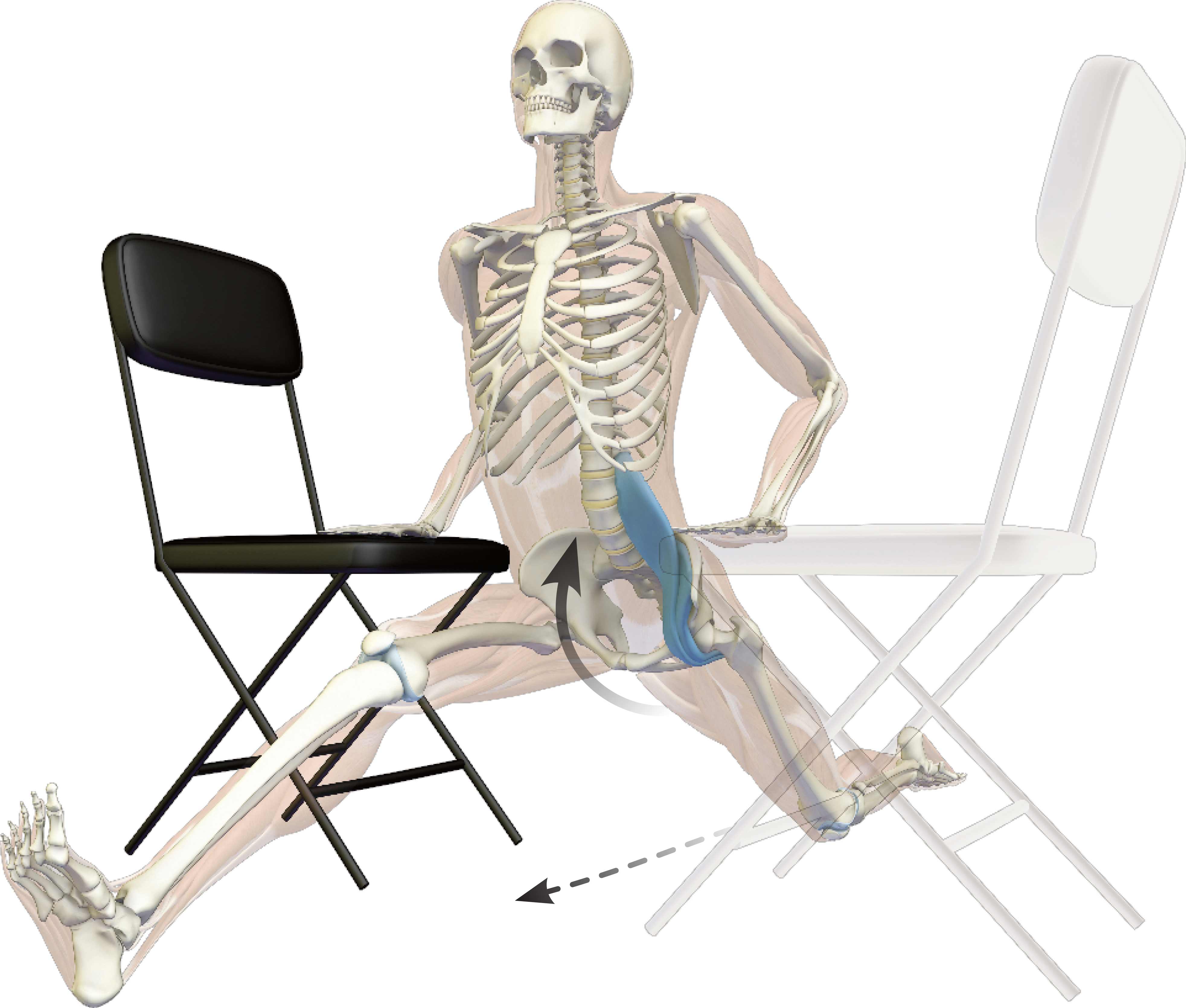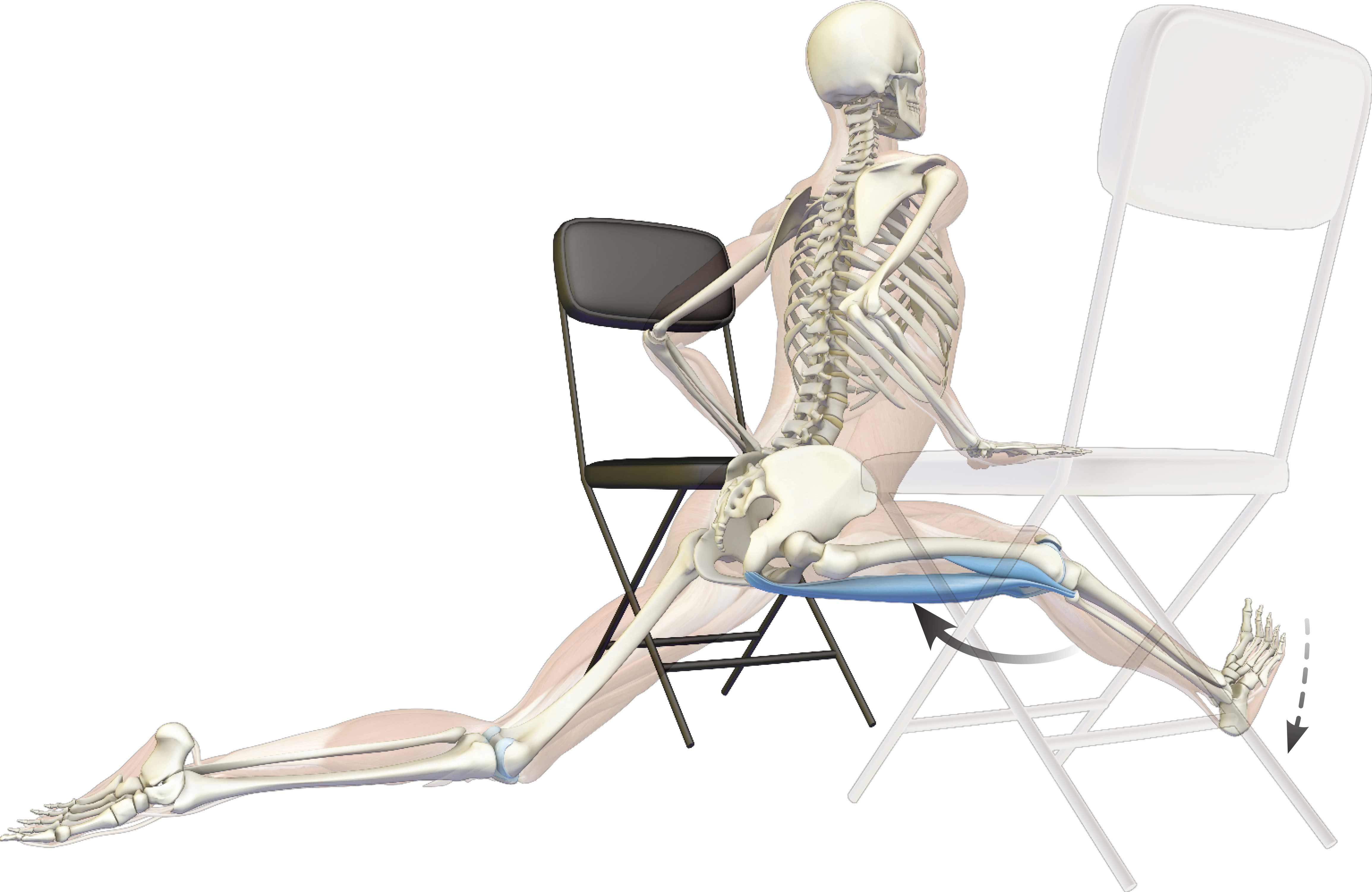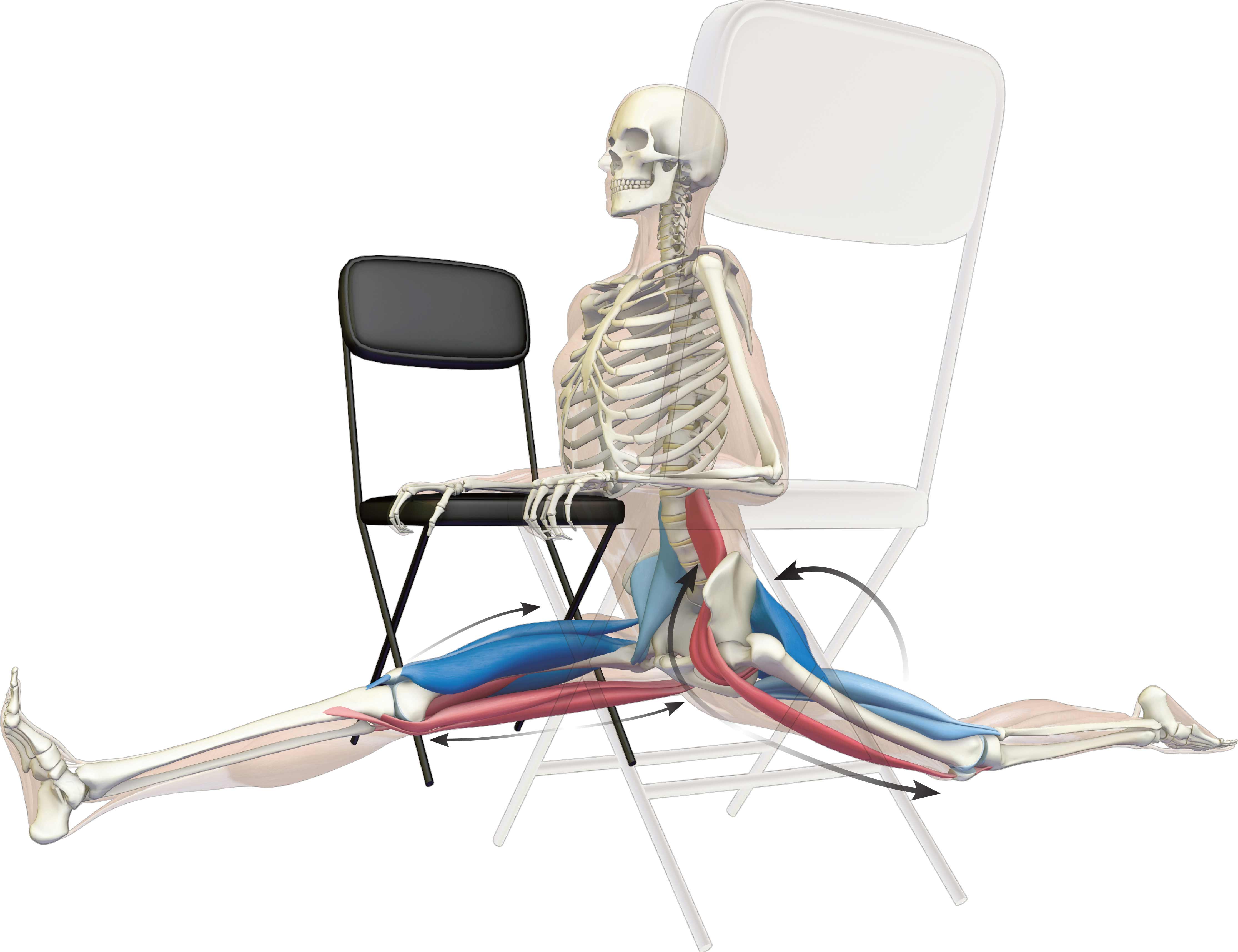 图六、图七 借由执行诱发式伸展来深化猴神哈努曼式。先在身体两侧各放一把椅子,作为支撑身体之用,接着把注意力放在前腿腘绳肌的诱发式伸展。为了达到效果,请将前腿膝关节弯曲15度左右。弯曲膝关节,可使原本就已伸展的腘绳肌产生更多张力,亦可避免膝关节过度伸直。