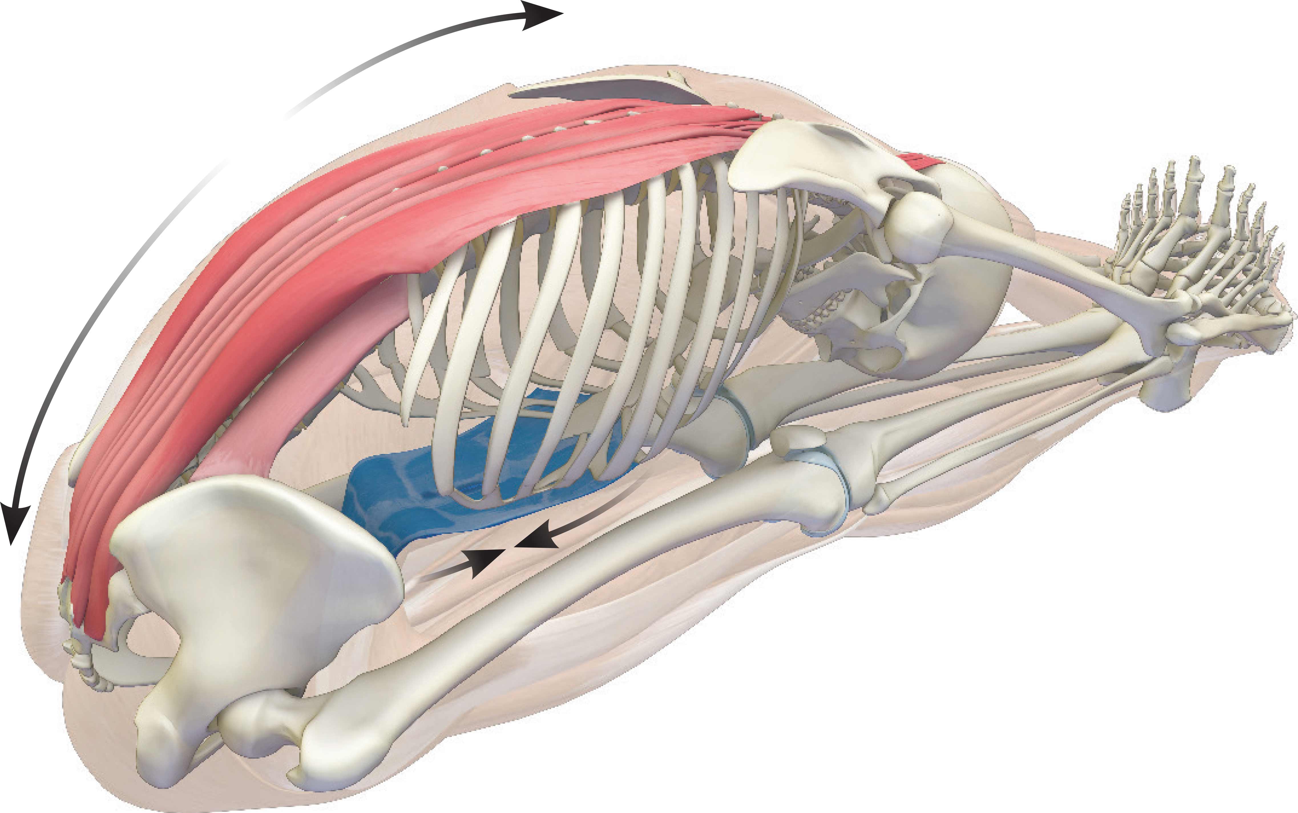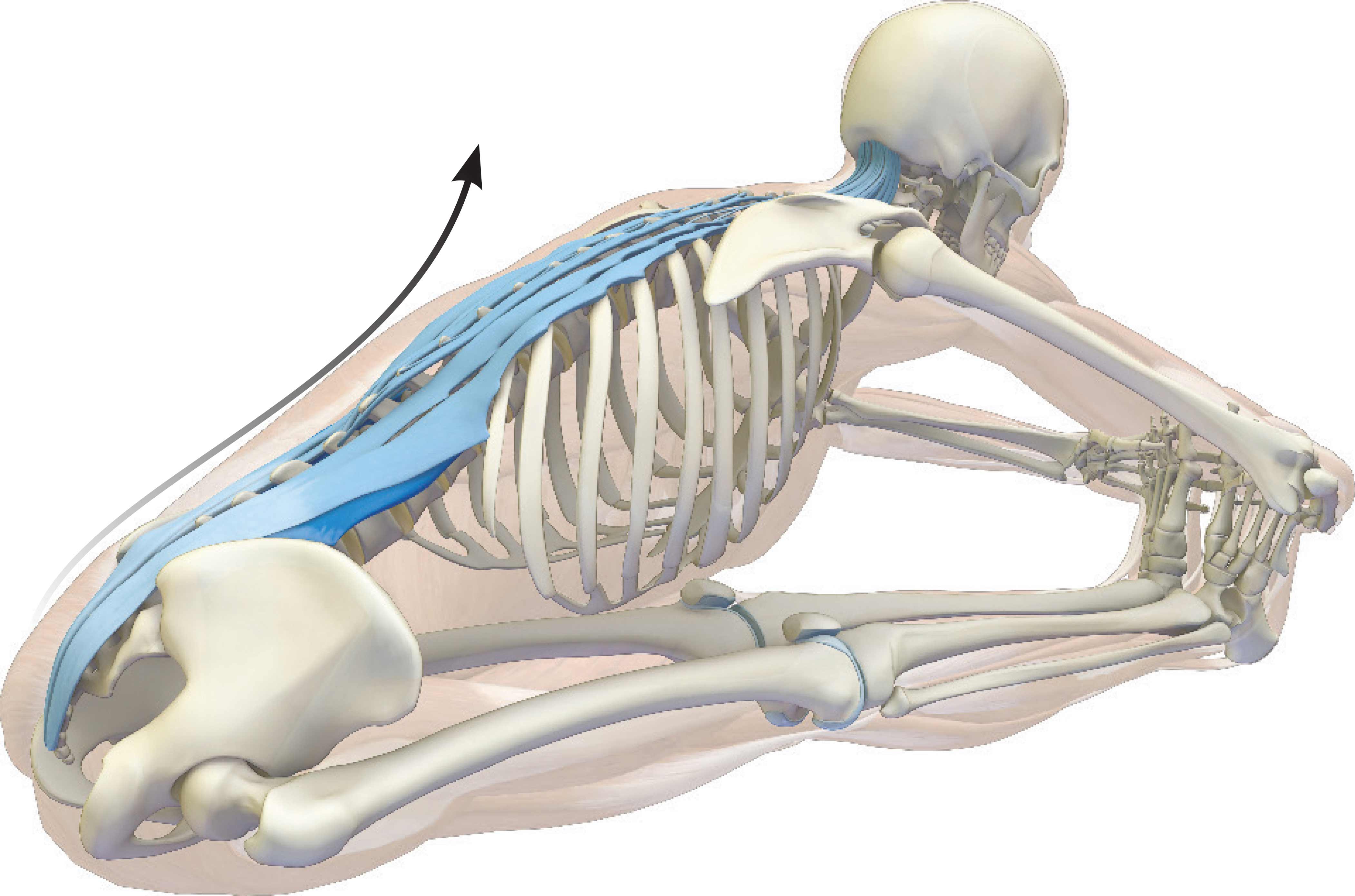 图四、图五 竖脊肌和腰方肌也可依照相同步骤。首先,前弯躯干,伸展背部肌肉,并将双臂弯曲,以维持伸展的动作。接着,尝试挺背。这个动作会增加竖脊肌和腰方肌在肌肉-肌腱连接处的张力,刺激高尔基腱器官,可令背肌放松。维持这个挺背姿势5~8个平稳的呼吸后,吐气收缩腹肌,并借由双臂以及反射弧所增加的肌肉长度,把背肌拉长,带入更深的体式。启动腹肌还可产生背部肌肉的交互抑制作用,使背部肌肉放松,进而伸展。