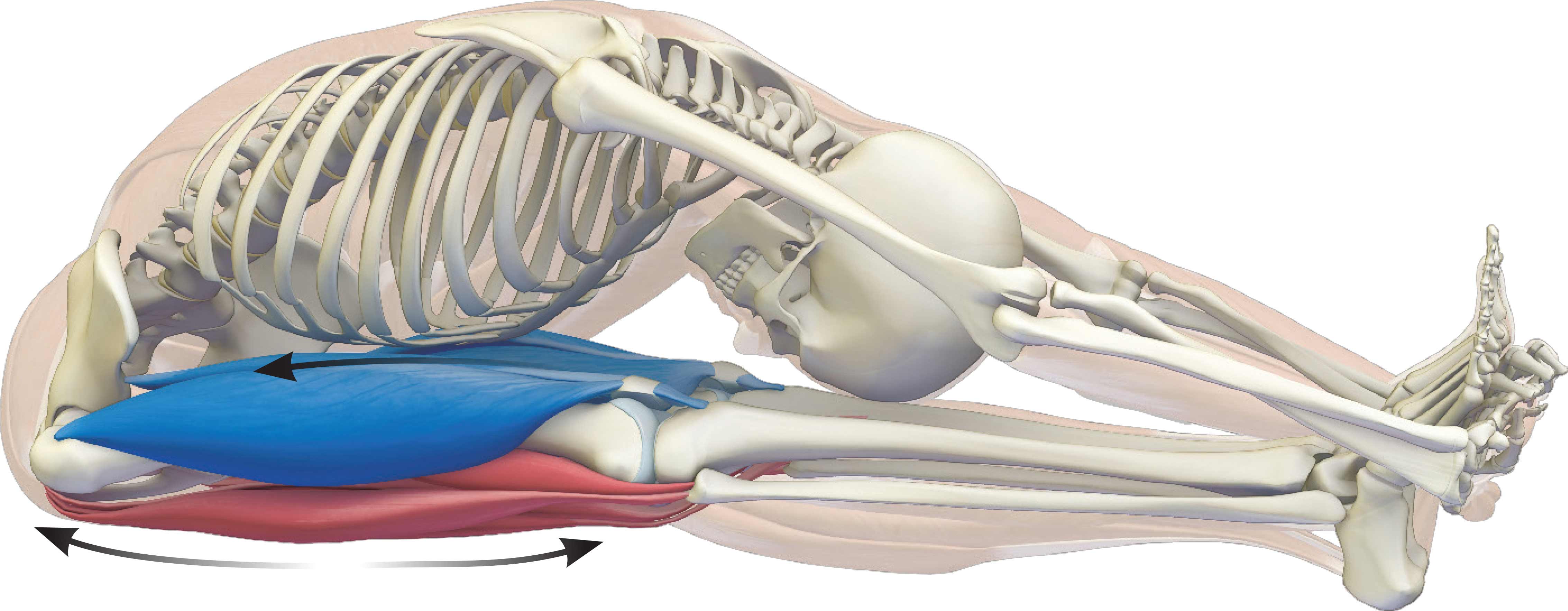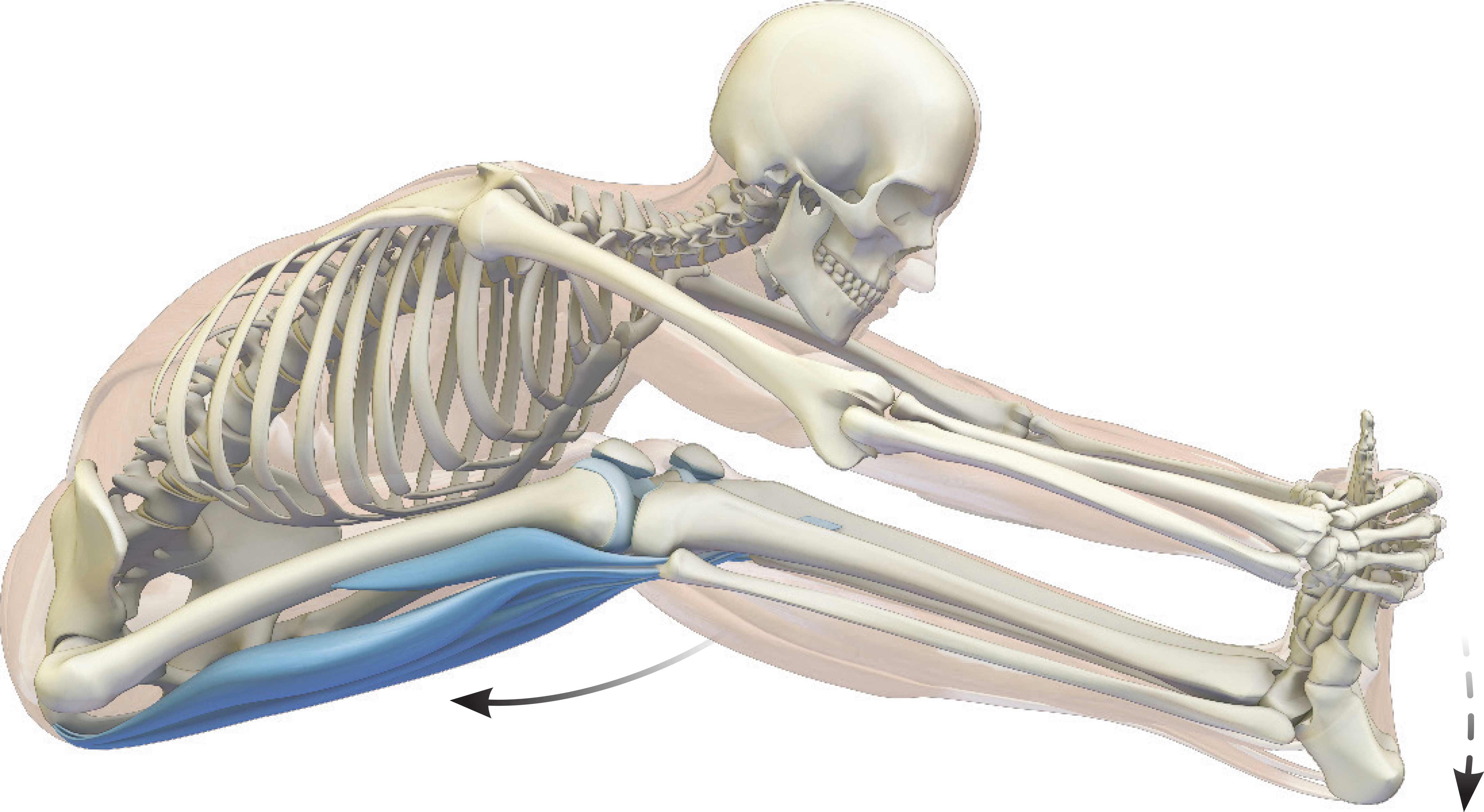 例如练习坐姿前弯式时,先稍微屈膝,让躯干靠向大腿。接着,足跟轻轻压向瑜伽垫,仿佛要进一步弯曲膝关节。这个动作会收缩腘绳肌,并刺激位于肌肉—肌腱连接处的高尔基腱器官。持续收缩腘绳肌,维持5~8个呼吸后,再解开屈膝的动作。这么做产生的放松反应会增加腘绳肌的长度。之后,收缩股四头肌,以伸直膝关节并伸展松弛的肌肉。加上原本就有的交互抑制作用,腘绳肌此时可进一步放松,进而伸展。
