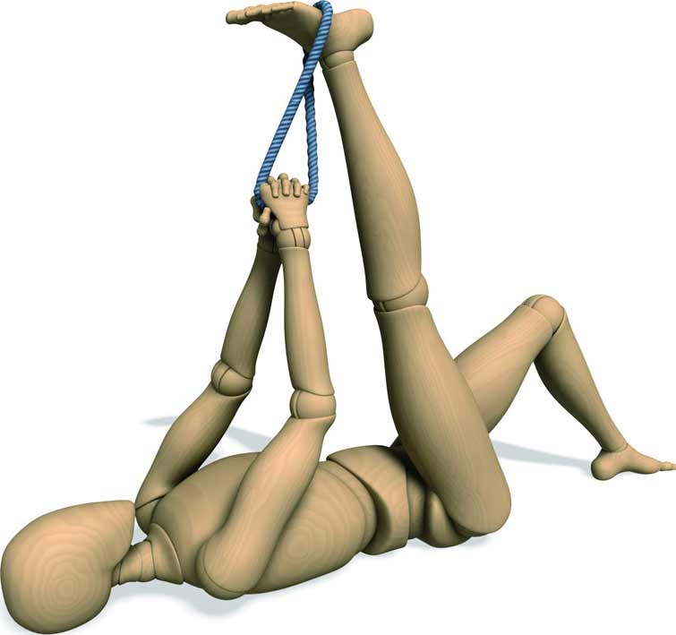 如下图所示,先用瑜伽绳套住上抬腿。弯曲肘关节,将腿拉近身体。切记伸展腘绳肌时,不能躁进,更不宜施力强压,否则会伤及腘绳肌。当身体够柔软,双手便有办法碰到足部或小腿。紧握足部,并用肩膀的肌肉,尝试将双臂往头部的方向上举,把上抬腿带入更深的伸展。进行时,另一条腿可保持弯曲,但到了完成阶段,就要伸直膝关节,内旋大腿。
