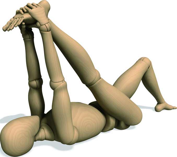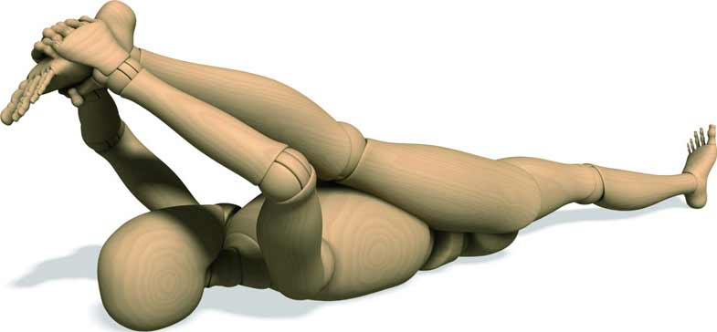 仰卧手抓脚趾伸展式A是应用诱发式伸展的绝佳姿势。首先,双手牢牢握住足跟,接着尝试在屈膝状况下将腿慢慢伸直,令腘绳肌做离心收缩的动作。这个动作会刺激高尔基腱器官,使其传送讯号至脊髓,而脊髓一收到讯号,也会马上命令腘绳肌放松,进而伸展,完成整个反馈回路。控制肌肉张力和长度的系统十分复杂,这里仅说明部分环节,此外,也要小心运用诱发式伸展这项技巧。尽管本体式重点是伸展上抬腿的后侧,但是瑜伽垫上的那条伸直的腿也是关键。同时保持髋关节伸展、大腿内旋、足跟紧贴着地面,极具挑战性,但却是我们努力的目标。利用臀部和下背的肌肉,把足跟往下拉,并利用髋关节内旋肌,使膝盖骨朝向正上方。后续的肌肉讲解中,会再说明这项技巧。