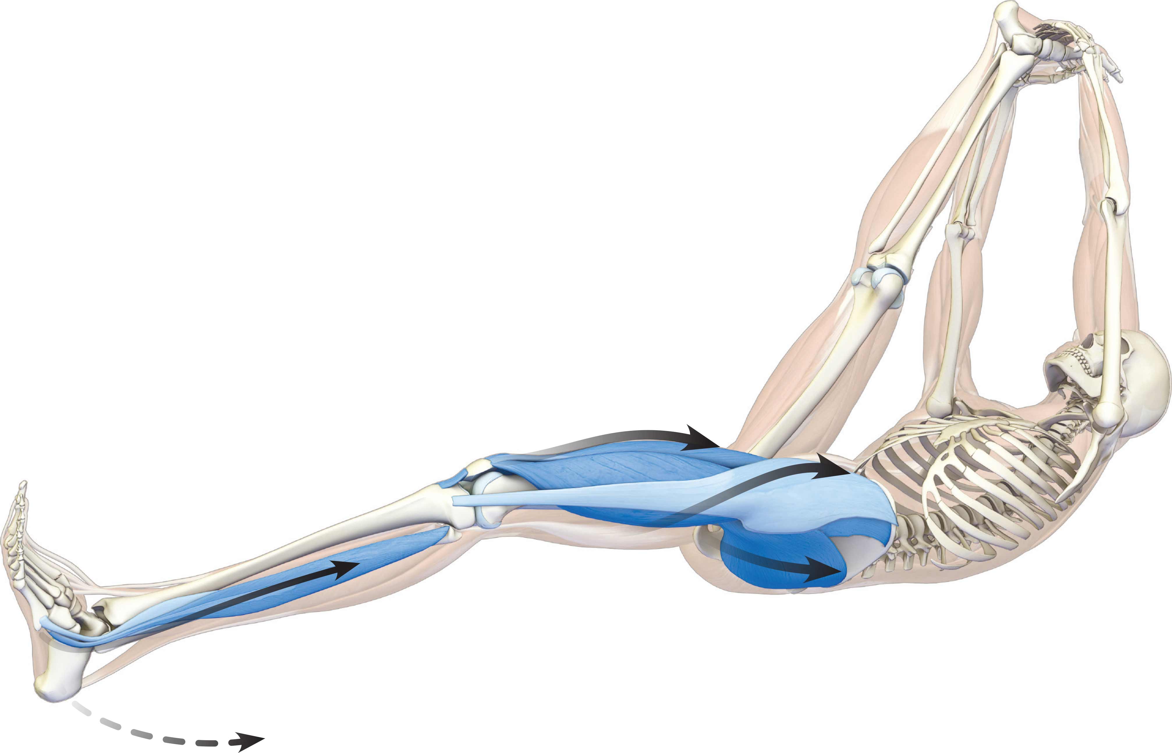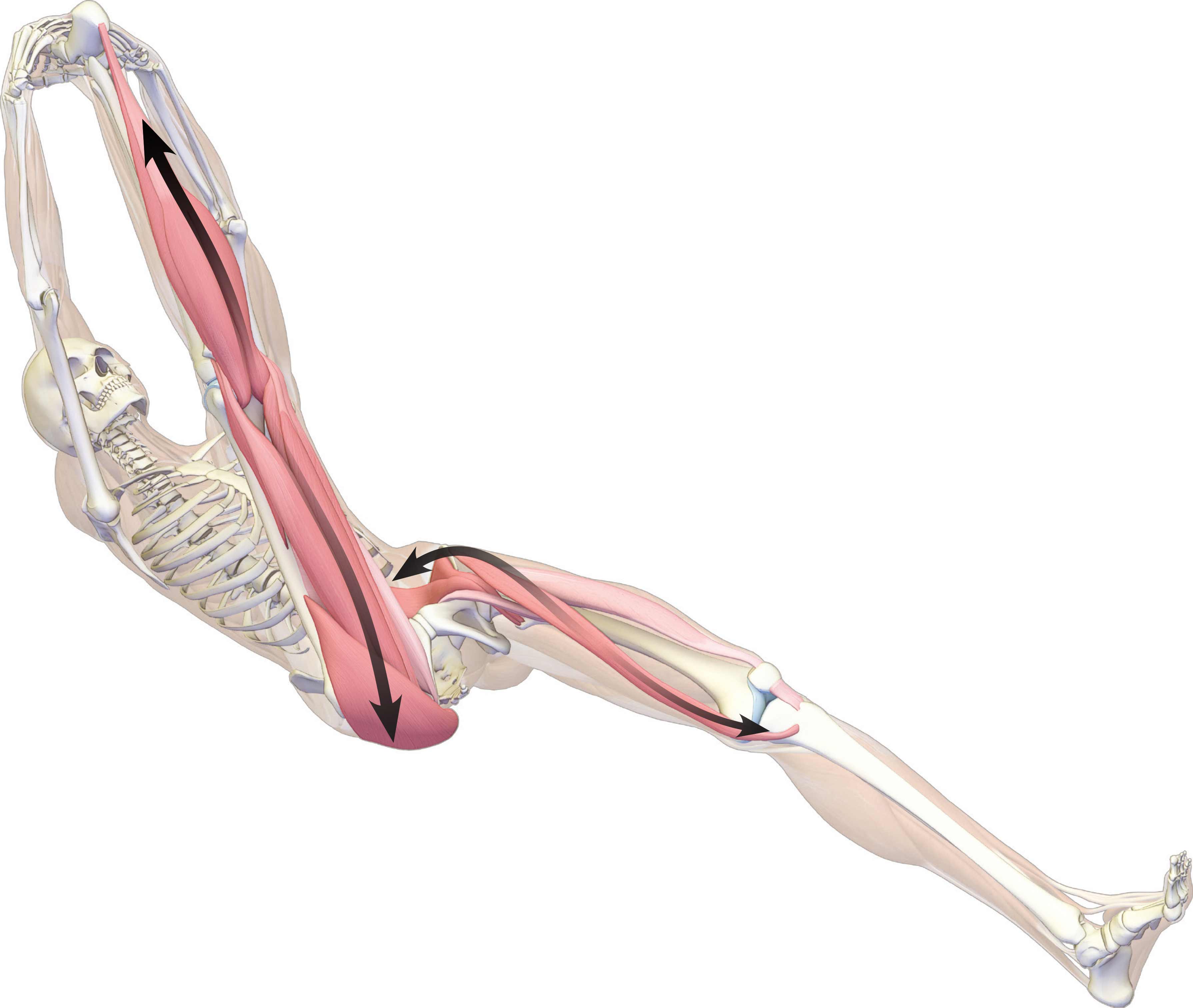 步骤三 收缩竖脊肌和腰方肌,做挺背动作,此时,骨盆会前倾,使腘绳肌的起端往后移并远离止端,整条肌肉也随之伸展。收缩下三分之一的斜方肌,使肩膀下拉,远离颈部。仔细感觉足部如何在这个动作的带动下更靠近脸部。启动菱形肌,让两块肩胛骨往身体中线靠拢,以扩展胸腔。