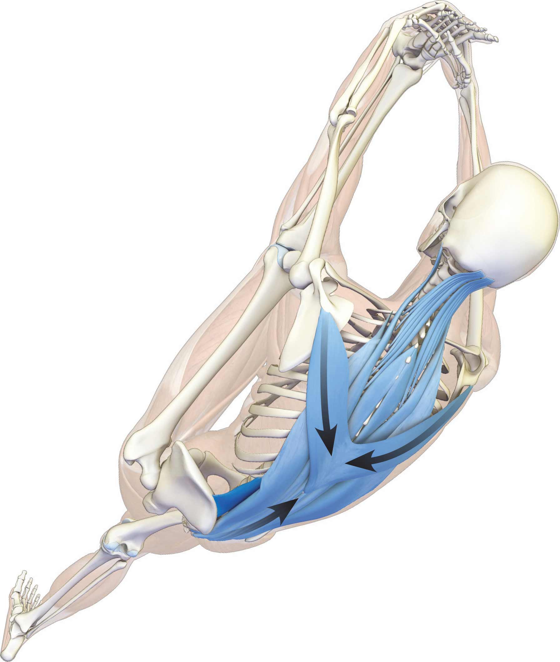 总结 前述动作能伸展上抬腿后侧的肌肉,包括臀大肌、内收大肌、腘绳肌和腓肠肌。地面腿前面的髋屈肌也会保持伸展,包括腰肌、耻骨肌、内收长肌、内收短肌、缝匠肌和股直肌。