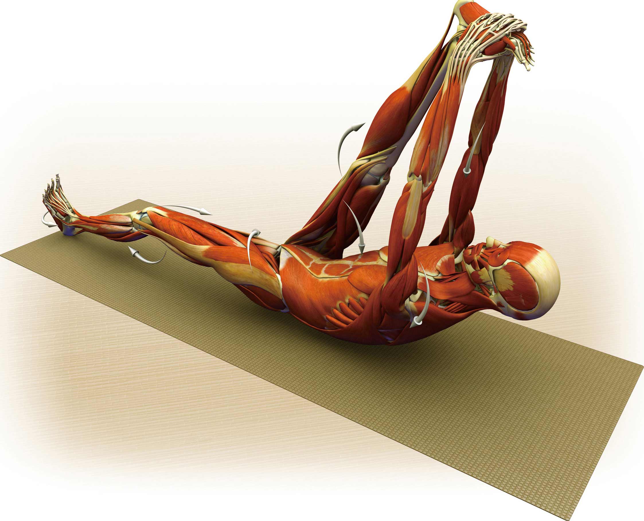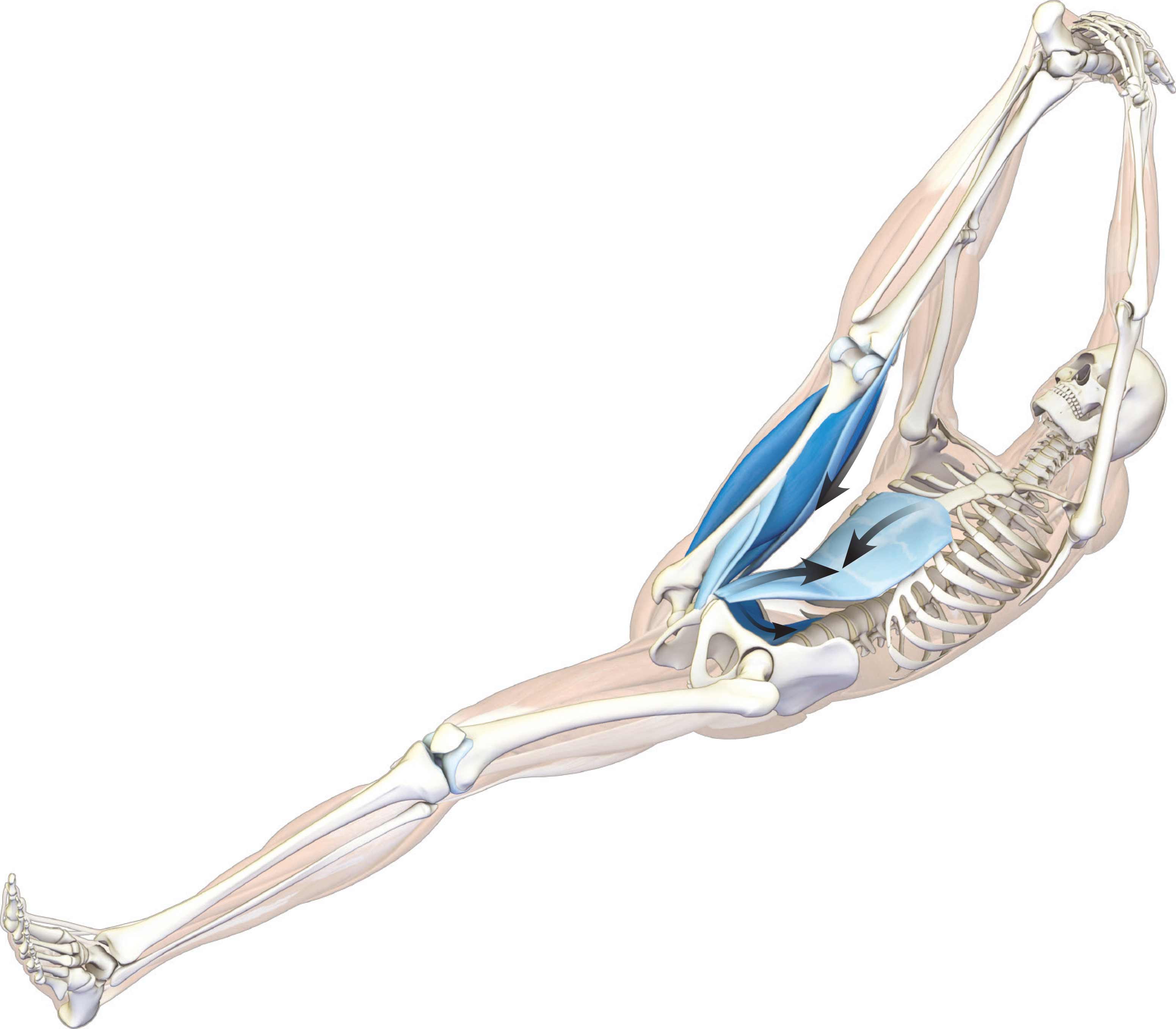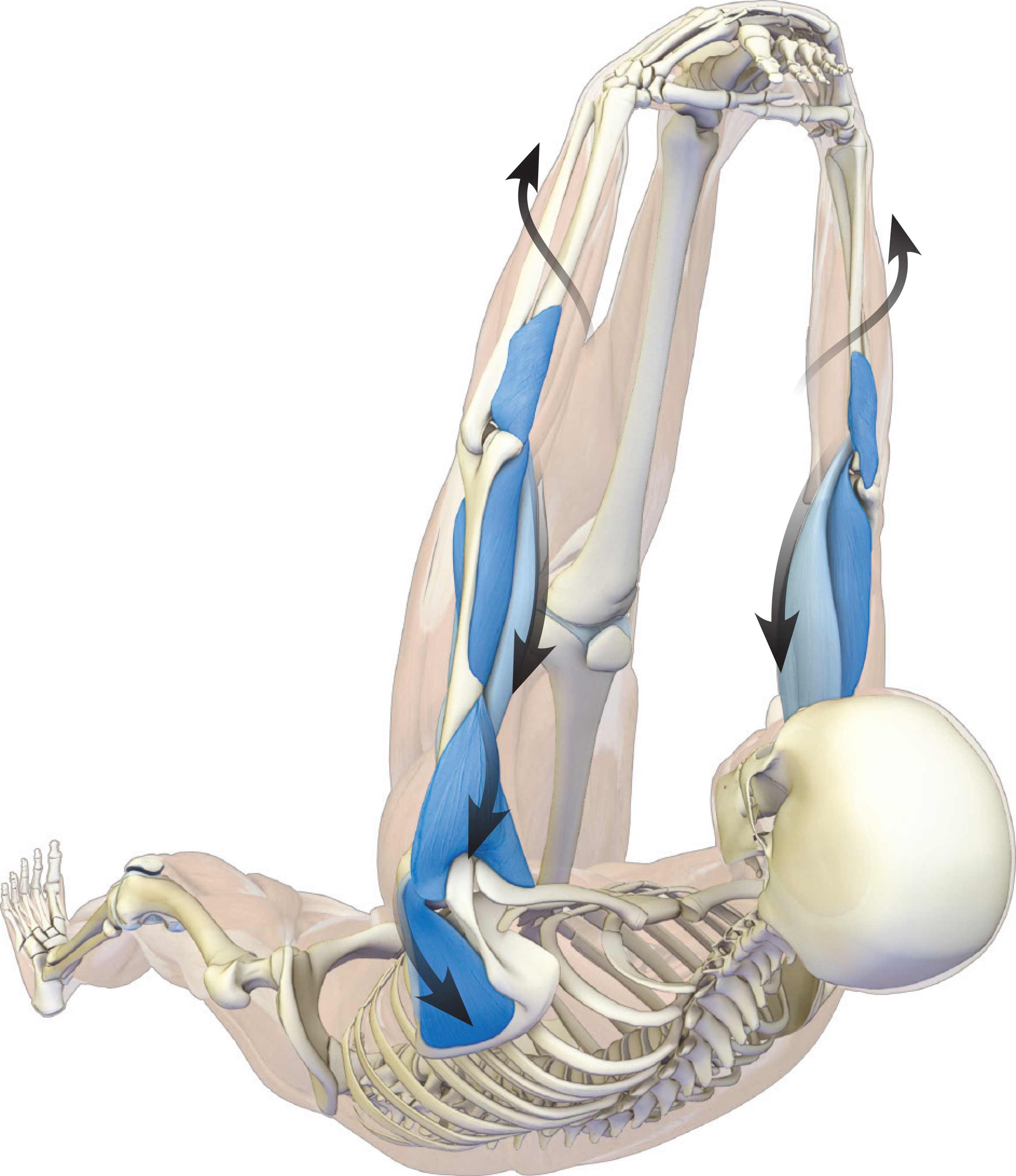 步骤二 双手握住足部,并尝试将双臂高举过头。这个动作会收缩三角肌前束,把上抬腿带入更深的伸展。接着,启动肩关节旋转肌群的冈下肌和小圆肌,以外旋肩关节,并收缩肱二头肌和肱肌,以弯曲肘关节,把上抬腿带入更深的伸展。双手紧握足部、尝试把掌心上翻,使前臂旋后。如此一来,足部、肘关节和肩关节之间便形成了一股“螺旋”力道,产生的扭转效果也进而固定足部,并加深腿的伸展。