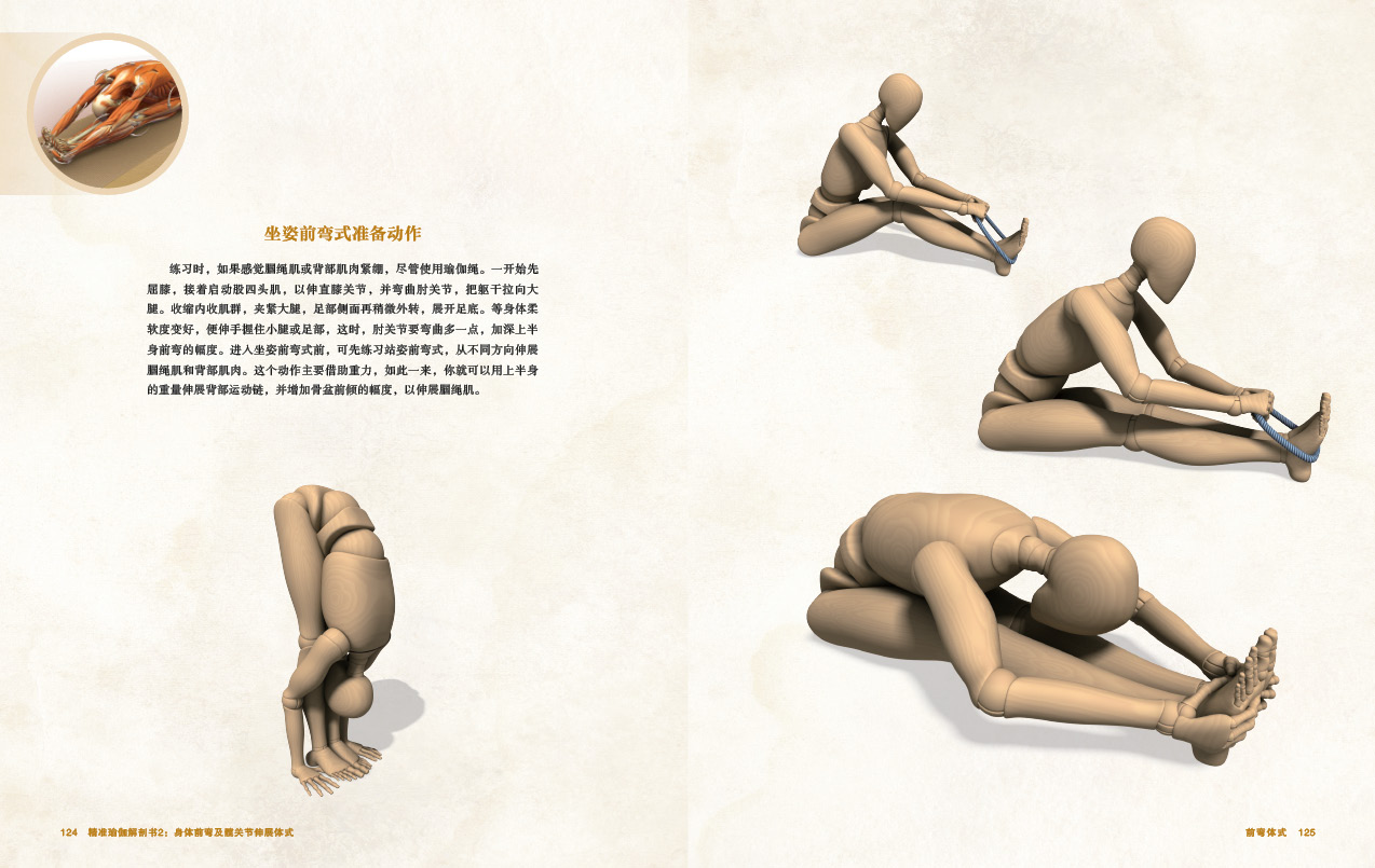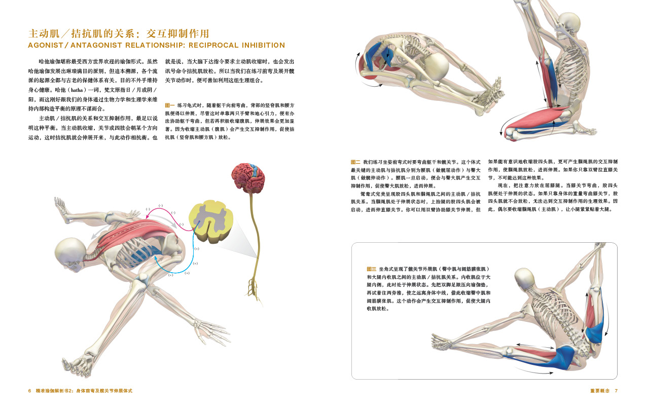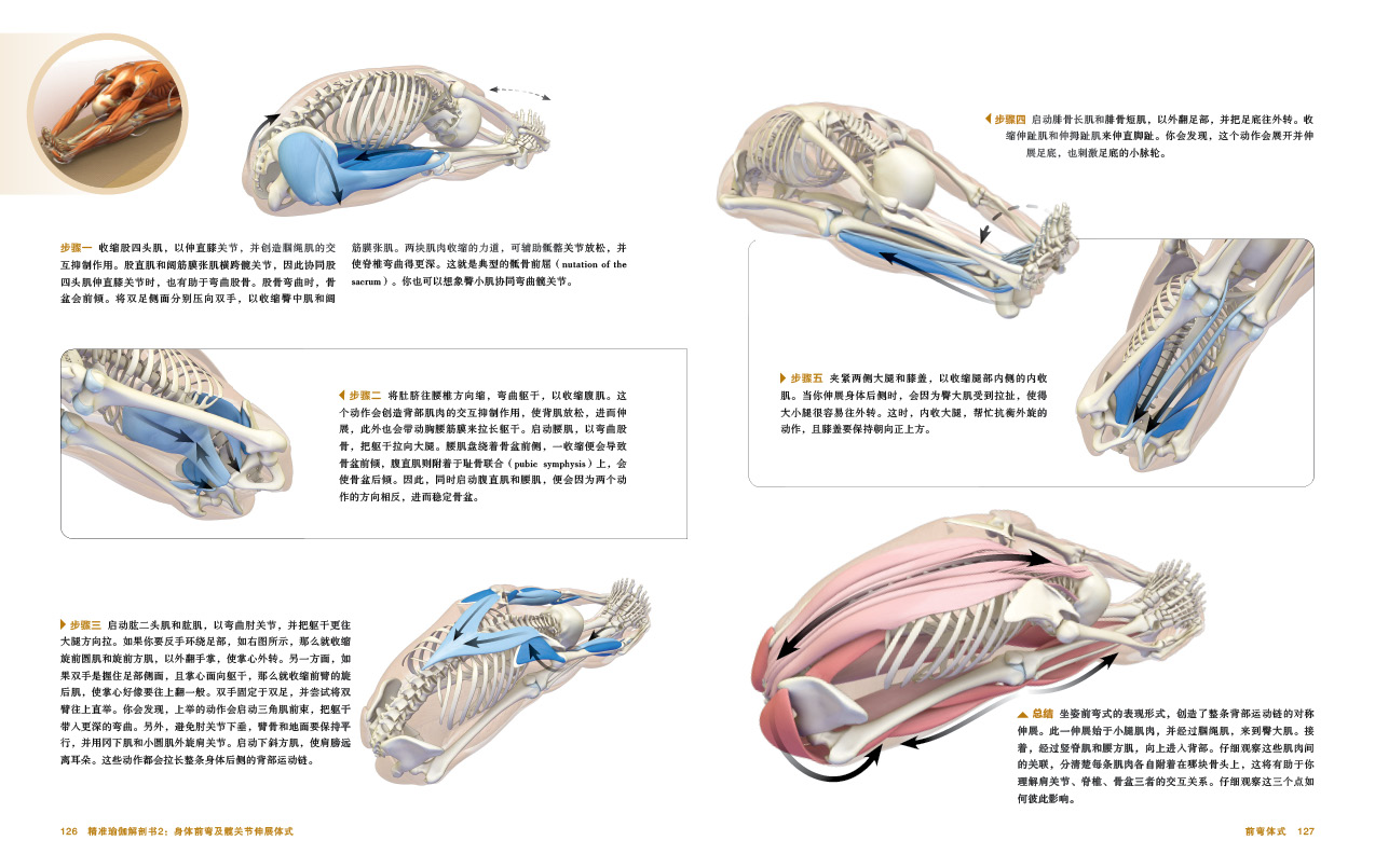 图四 本书利用详细的步骤解说图,教你如何收缩(启动)控制关节摆位的肌群,结尾则简要归纳所有伸展的肌群。深浅不等的蓝色代表收缩的肌肉(原动肌群以深蓝色标示),红色则代表被伸展的肌肉。善用体式介绍一节,便能充分掌握各个体式的解剖学知识。