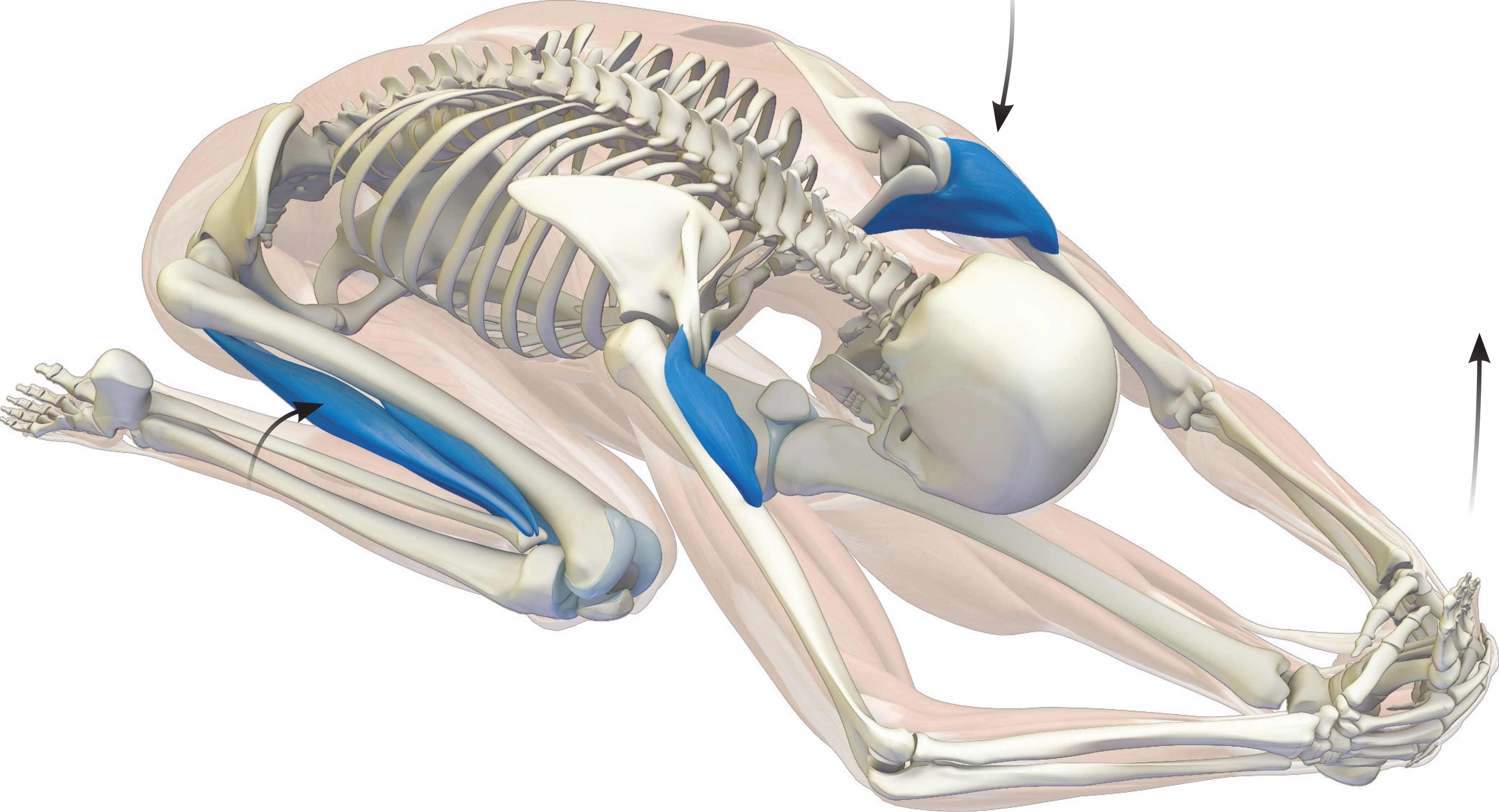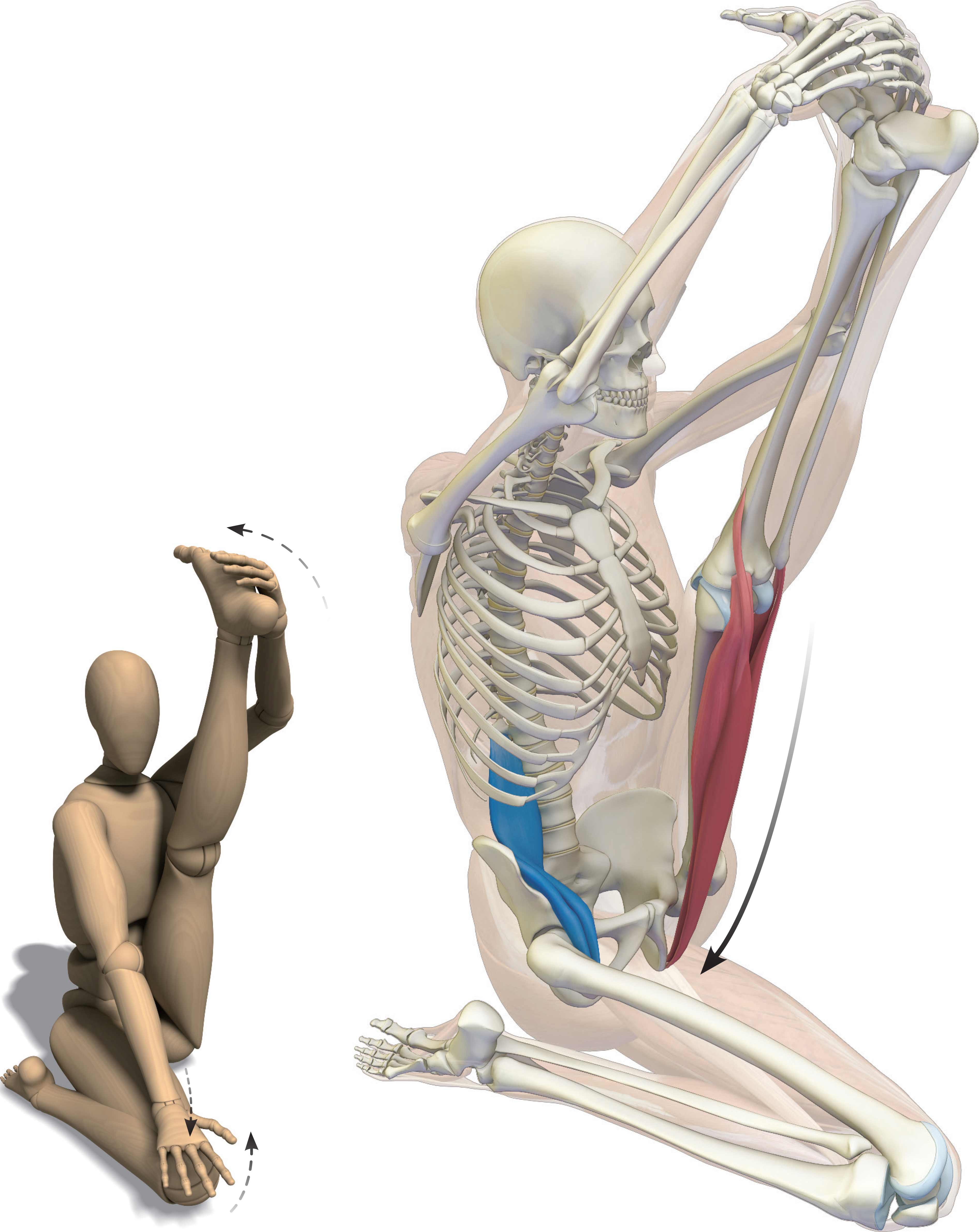 图二 练习前弯体式时,若以单腿跪伸展式为例,双手先握住足部,接着尝试将双臂往天空方向举。这会收缩三角肌前束。由于双手正牢牢抓住足部,因此三角肌前束收缩时,反而会把躯干往前拉,进入更深的前弯。与此同时,屈膝腿的小腿和大腿都要坐稳,这会启动腘绳肌,有助于膝关节保持在正位。