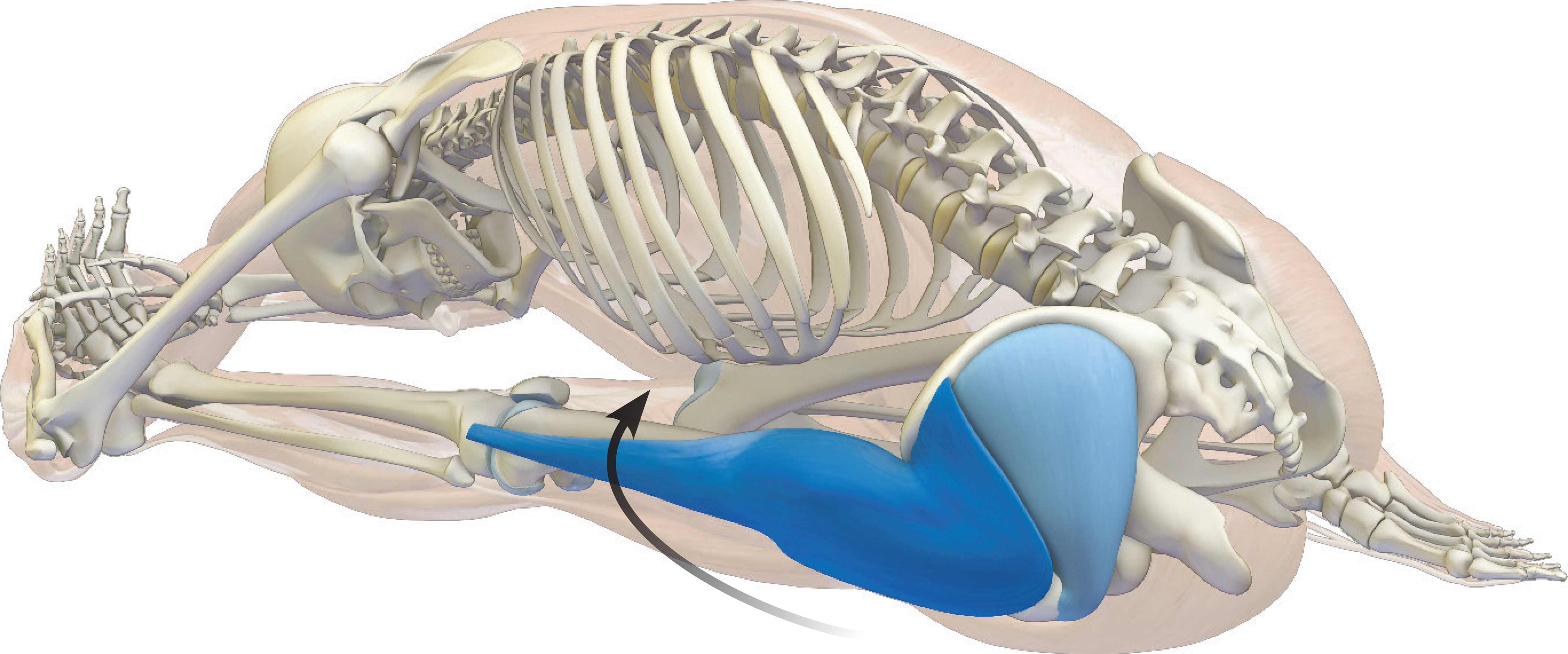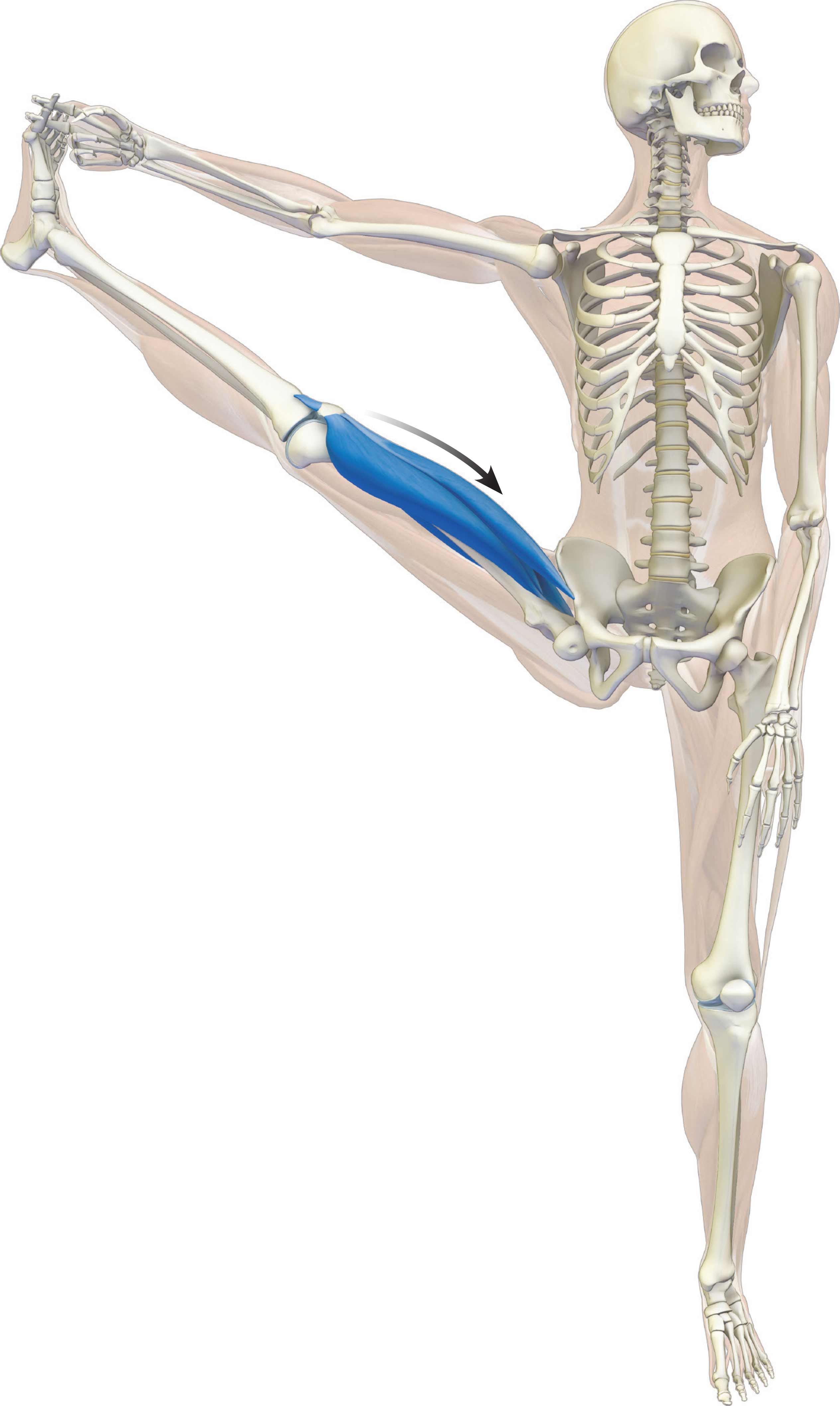 股四头肌一启动,膝关节自然会处于正位,防止软骨受伤,同时也产生腘绳肌的交互抑制作用,使腘绳肌放松,进而伸展。我们在练习仰卧手抓脚趾伸展式B这类体式时,便要单独启动股四头肌这块主要肌肉。