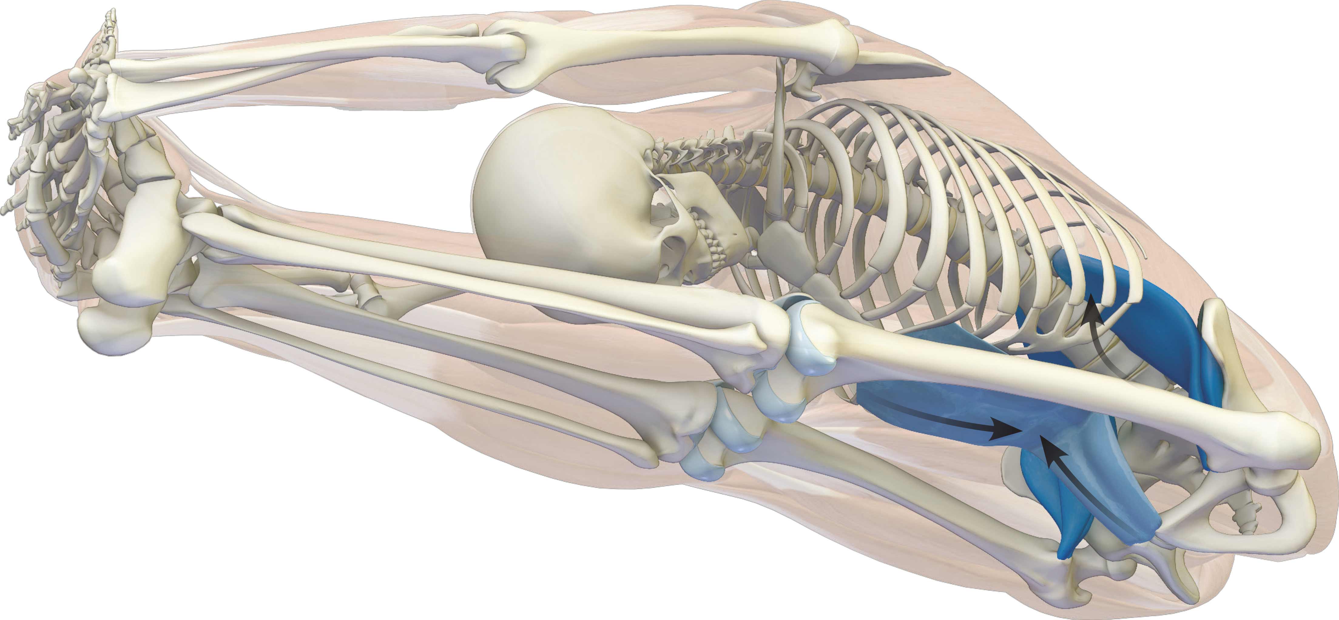 图二 前弯时,还要共同启动腰肌和腹直肌。收缩腰肌的诀窍是利用躯干紧贴大腿。只要腰肌和腹直肌共同收缩,便可同时弯曲躯干和髋关节,深化前弯姿势。