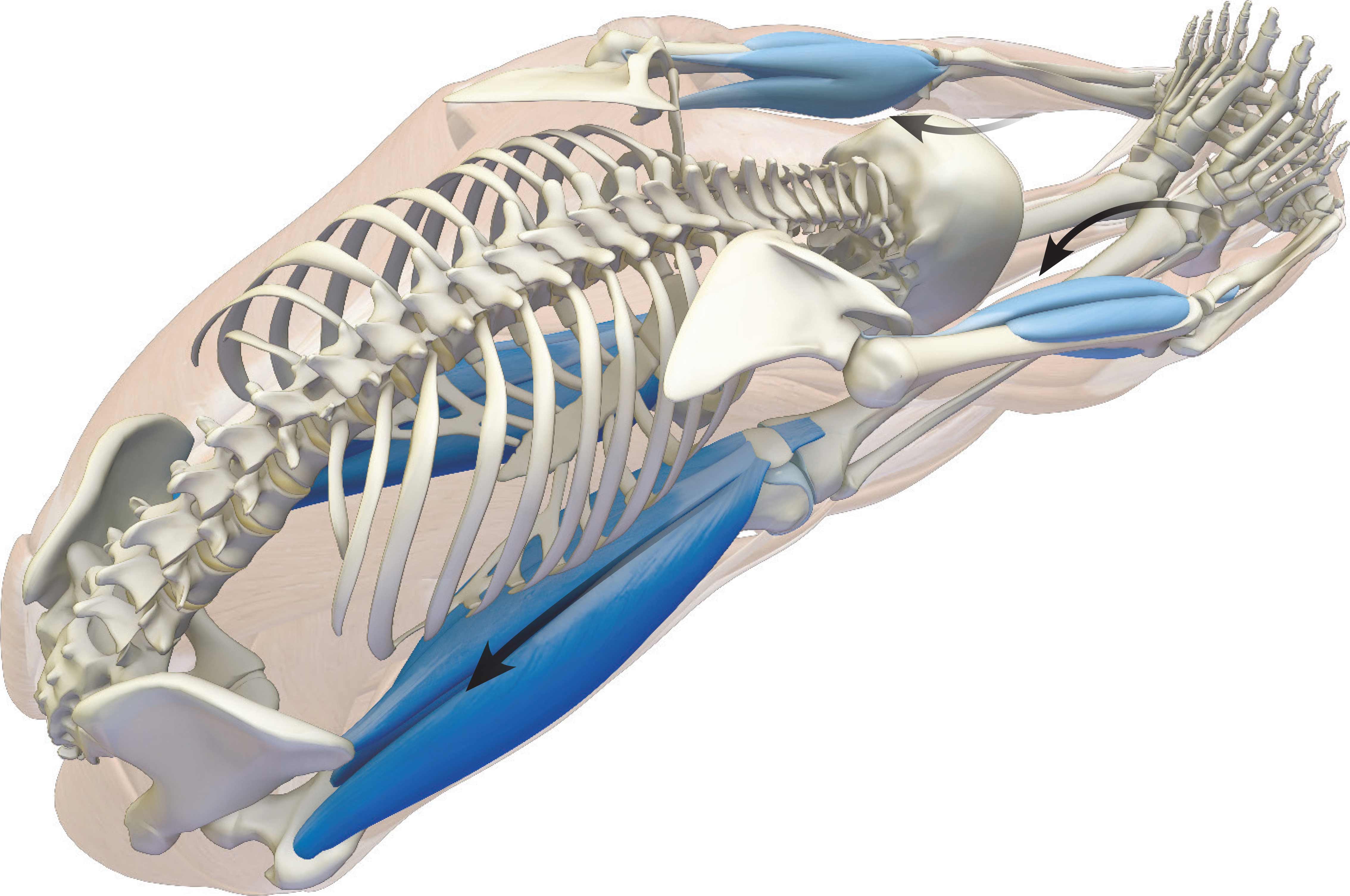 图一 练习坐姿前弯式时,要同时收缩肘关节的屈肌群和膝关节的伸肌群。收缩肱二头肌和肱肌,以屈肘并把躯干往前拉,进入更深的前弯。同时还要启动股四头肌伸直膝关节,并产生腘绳肌的交互抑制作用,使腘绳肌放松,进而伸展。仔细观察这两大肌群如何同时收缩,会使你更容易达成躯干前弯的动作。