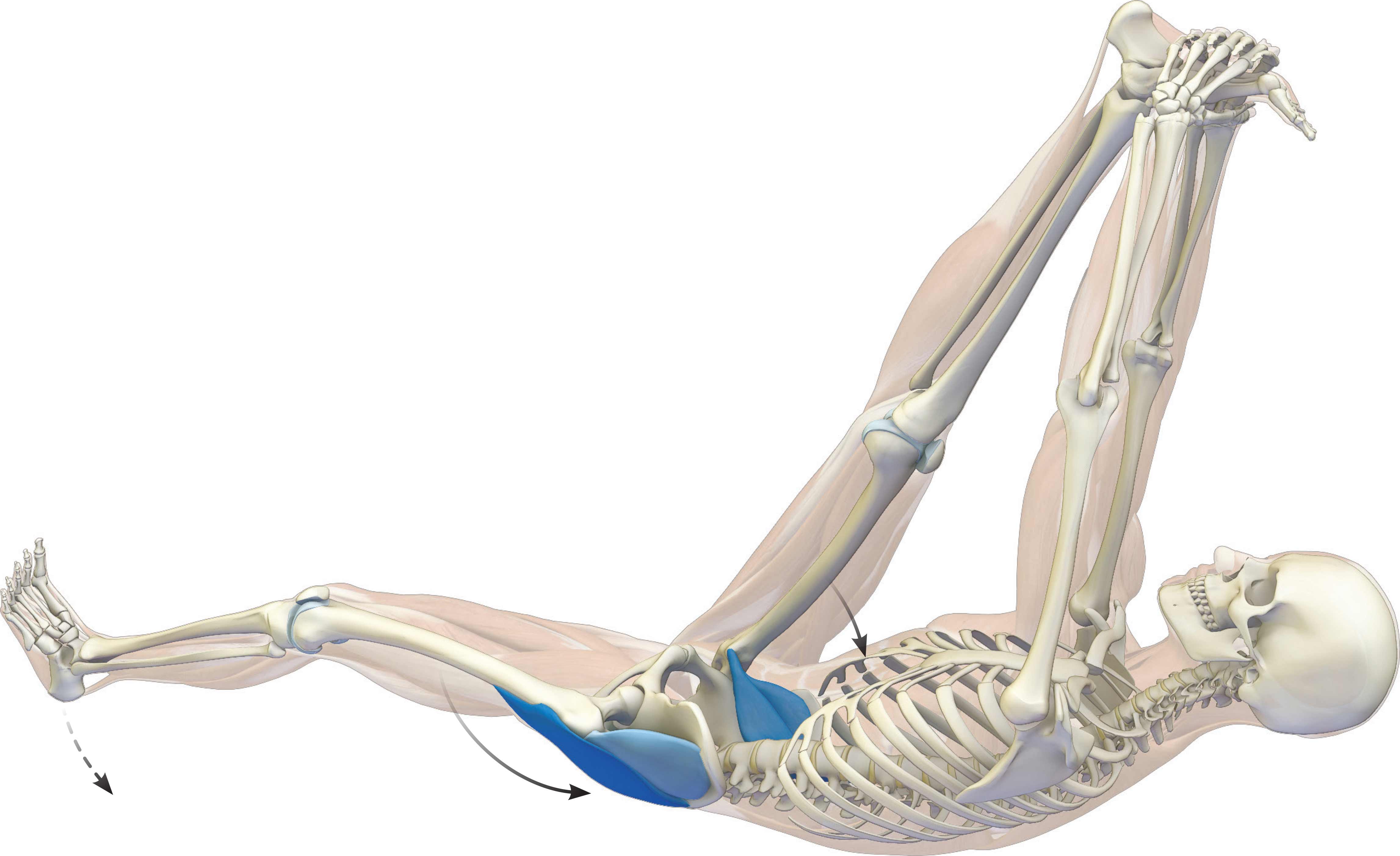 图三 练习仰卧手抓脚趾伸展式A时,我们要收缩臀肌,使地面腿的髋关节可以伸展开来。收缩臀肌的诀窍是,臀部用力,足跟压向瑜伽垫。与此同时,还要启动被双手抓住那条腿的腰肌及其协同肌。启动腰肌及其协同肌的诀窍是,把腿往头部的方向拉,使足部尽量远离髋关节。