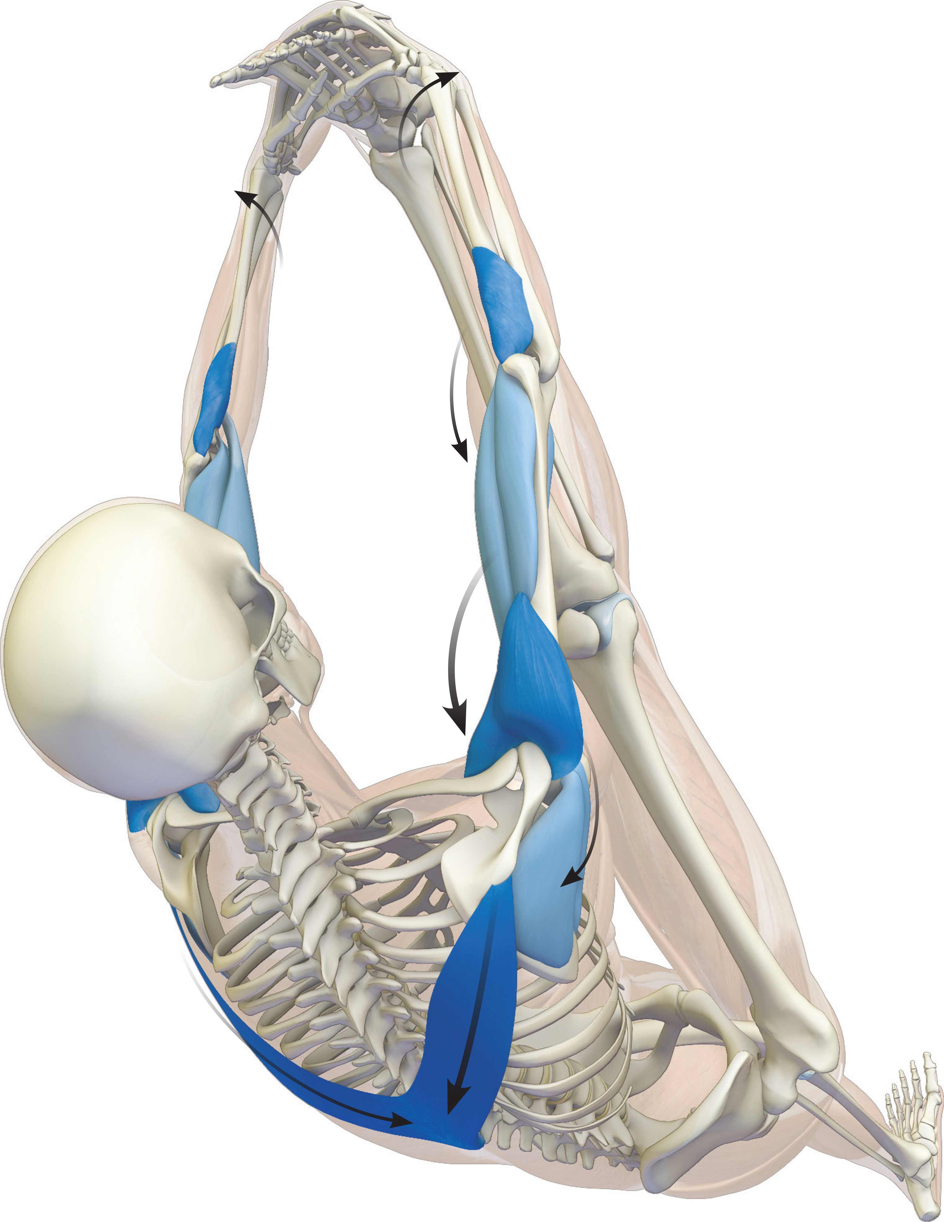 图四 双手握住足部,并尝试把掌心往上翻,做前臂旋后的动作,锁住手脚的连接。共同启动前臂、上臂及肩膀的肌肉,以把腿抬得更直,进入更深的伸展。之后,收缩肱二头肌和肱肌,令肘关节弯曲。双手紧握足部,往上抬(仿佛你要把一件物品高举过头)。这个动作会启动三角肌前束。接着,收缩三角肌后束、冈下肌及小圆肌,使肩膀外旋。最后,收缩下三分之一的斜方肌,把肩胛骨往下背拉。这有助于放松颈部并展开胸腔。