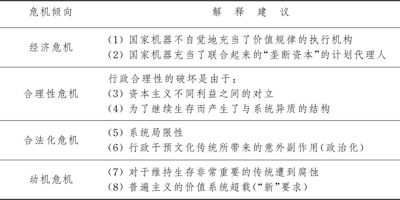 一方面,在晚期资本主义社会中,对使用行政计划来确保资本运作的需求在不断增大,另一方面,生产资料私人占有则要求国家干预有一定的界限,禁止对资本主义矛盾利益有计划地加以协调。另一种说法是奥佛提出来的。