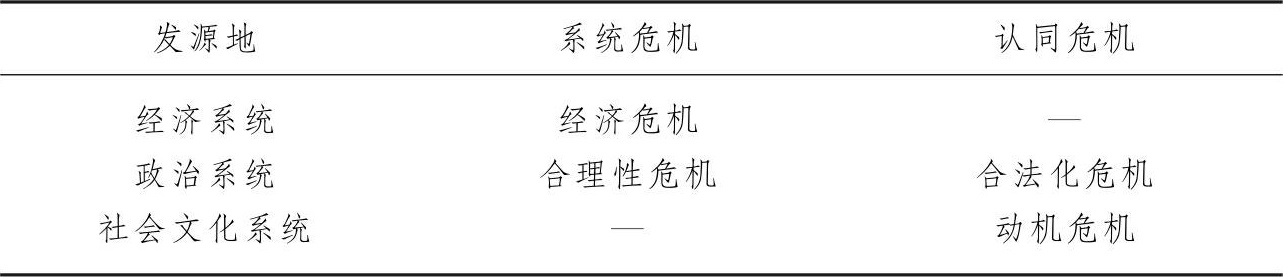 我们暂且将作为资本主义增长后果的全球性危机撇开不论,而来集中思考系统所特有的危机倾向。各种不同的地方都可能出现危机。同样,危机倾向爆发成为政治事件,其表现形式也各不相同。所谓爆发成为政治事件,是指现有政治系统的合法性遭到了否定。我认为有四种危机倾向,如表4所示。