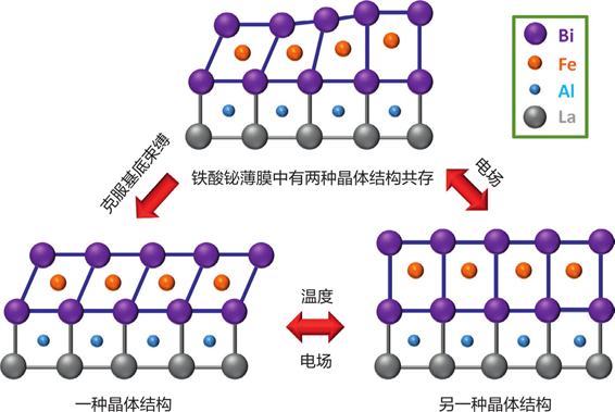 怎样才能克服基底的束缚呢?研究人员想到一个办法,他们在薄膜上刻蚀出一个孤立的“小岛”,让这个区域与周围断开,不再受到周围环境的束缚。随着“小岛”的面积越来越小,研究人员终于得到了仅有一种晶体结构的铁酸铋晶体。然后,研究人员给这种晶体一个温度刺激,它的结构就会改变,完全转变成另一种晶体结构;而给新的晶体结构施加电场、温度等刺激,它又会恢复成之前的结构。