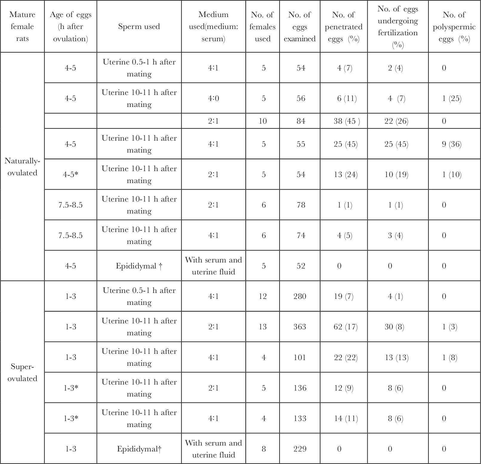 † Epididymal sperm were incubated in the presence of uterine fluid for 2-7 h before insemination.