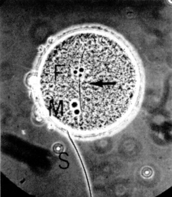 Fig. 1. A rat egg at pronuclear stage, fertilized in vitro , showing male pronucleus (M), female pronucleus (F), the fertilizing sperm tail (arrow) and a sperm attached to the zona pellucida (S). Photographed before fixation under a phase-contract microscope. Sperm for insemination were prepared either from the cauda epididymis or from the uterus of a female mated 0.5 to 1 h, or 10 to 11 h, previously. A drop of dense sperm mass was put into a watch glass and covered with 3 ml. of medium (modified Krebs-Ringer bicarbonate solution containing 114.2 mM NaCl, 4.78 mM KCI, 1.71 mM CaCl 2 ·2 H 2 O, 1.19 mM KH 2 PO 4 , 1.19 mM MgSO 4 ·7 H 2 O, 25.07 mM NaHCO 3 , 0.55 mM sodium pyruvate, 21.58 mM sodium lactate and 5.55 mM glucose, to which 4 mg ml. –1 of crystalline bovine serum albumin, 50 μg ml. –1 of streptomycin sulphate and 75 μg ml. –1 of penicillin G (potassium salt) were added). The p H value of the medium was adjusted to 7.4 to 7.5 by addition of 1 M NaOH and the final solution was filtered through a millipore filter to ensure asepsis. Blood of female rats was collected by heart puncture, allowed to clot and then centrifuged. Serum was sterilized by filtration through a millipore filter and stored under paraffin oil at 2 to 5℃ for no longer than five days. The uterine fluid was collected from oestrous rats by means of a syringe needle. Insemination was performed by adding 0.4 ml. of the sperm suspension to the egg clot under the oil, after removing oviducts and débris. In some cases the egg clot was washed three times with the same medium to remove the oviducal fluid. After adding 0.1 or 0.2 ml. of heated rat serum (at 56℃ for 40 min), the eggs and sperm were thoroughly mixed and incubated at 37℃ in an atmosphere of 5% CO 2 in air. The final concentration of sperm in the suspension was 1,000 to 4,000 sperm mm –3 .