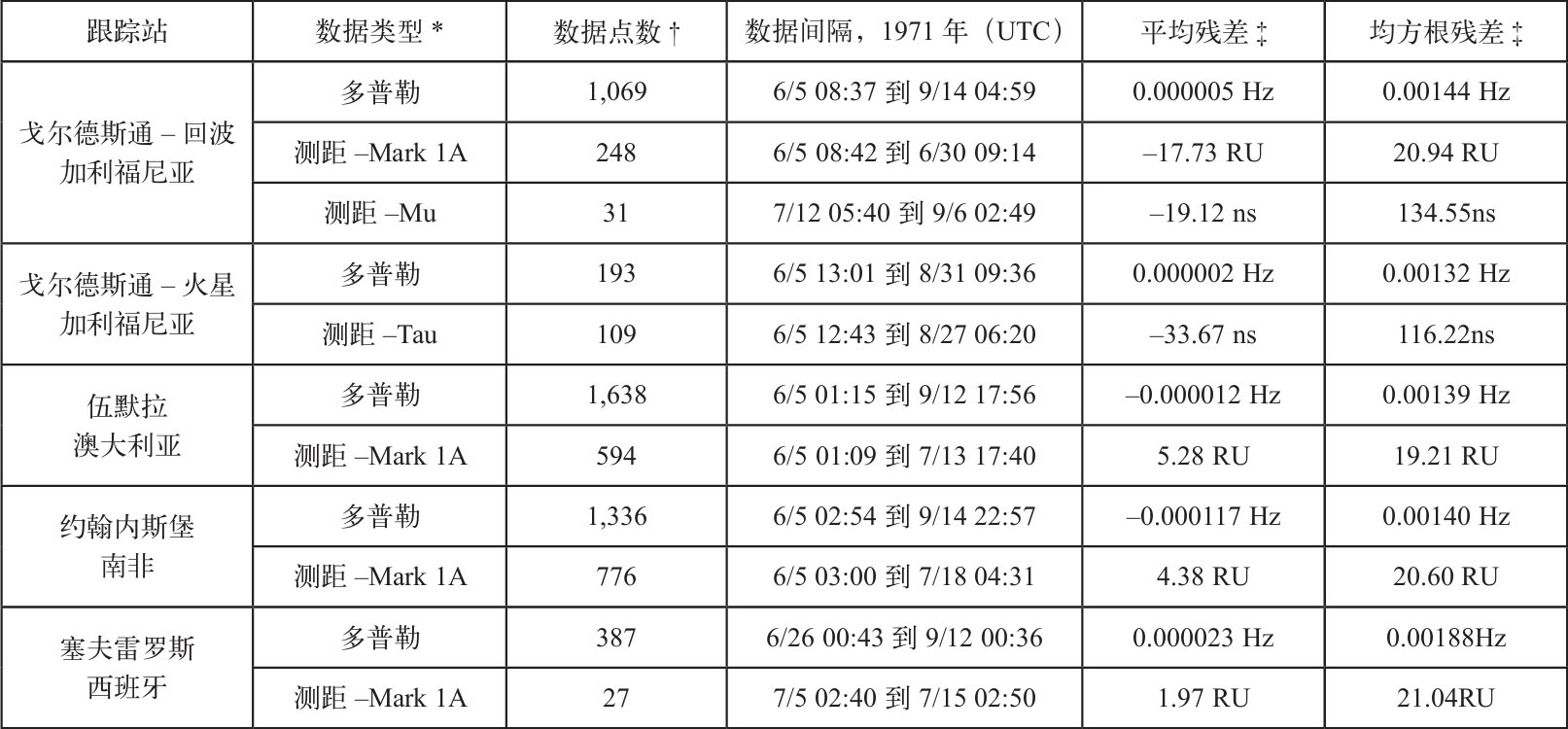 地月质量比是基于15周的测距和多普勒数据(1971年6月5日到9月15日)而确定的。表1给出了数据范围,同时我们也列出了由最佳测定结果得到的统计数据。使用了喷气推进实验室双精度轨道测定程序处理数据 [1] ,该程序使用了考埃尔轨道积分和批处理最小二乘滤波器。在考虑测距数据的权重时,我们非常谨慎,以确保使用最优的数据,避免和多普勒数据出现不一致。1969年的火星水手号结果显示,这样的不一致性会导致估计参数出现较大误差。 英文