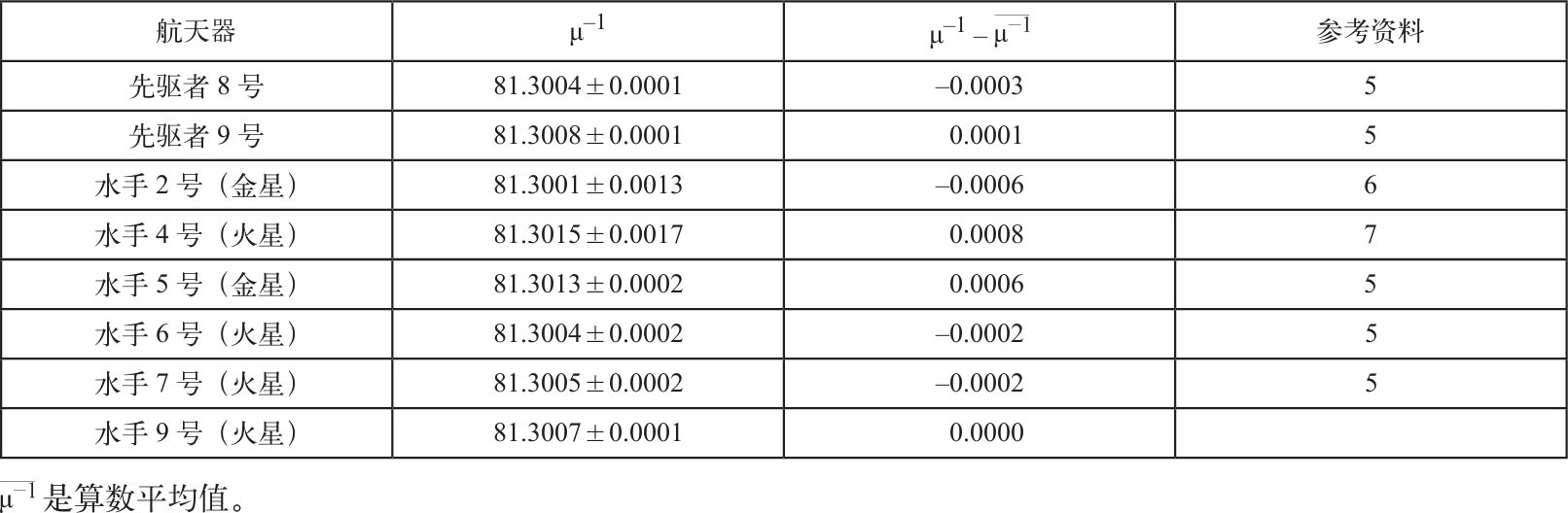 表2中给出了1971年火星水手号的数据以及以前由先驱者8号、9号和水手2号、4号、5号、6号和7号得到的结果。对于先驱者8号、9号和水手2号的结果,计算时只用了多普勒数据。有趣的是,水手9号得到的数值和所有飞行器得到的μ –1 平均值都是81.3007。水手号和先驱者号的结果与算术平均值的偏差列在了表1里。而且,由最后5次(先驱者8号、9号和水手6号、7号和9号)发射的行星际航天器的数据计算出的质量比差别都在0.0004的范围内。先驱者8号、9号和水手6号、7号和9号的结果分别是81.3004、81.3008、81.3004、81.3005和81.3007。这很好地表明了μ –1 的精度。质量比变化的减小主要归因于数据质量的提高,这都源于深空探测网络跟踪系统的改进以及在计算机软件数据类型中单精度变为了双精度。 英文