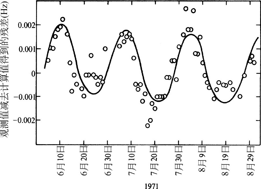 从地球飞向火星的水手9号航天器使用由喷气推进实验室(JPL)深空探测网记录的相位相干测距和多普勒跟踪数据进行导航。这些数据也确定了地月质量比,这涉及以下物理事实:地球围绕地月系统的质心转动,使得测距和多普勒跟踪数据成为正弦曲线,频率与月球相对于恒星的平均运动相同。这个特征如图1所示,其中对质量比作了0.0003的扰动(μ –1 为地球质量与月球质量之比)。通过找到恰当地反映地球质心运动幅度的μ –1 ,就可以在跟踪数据中去除此正弦变化。这是一种直接的方法,在实际应用中完全和处理跟踪数据用到的其他参量无关。 英文