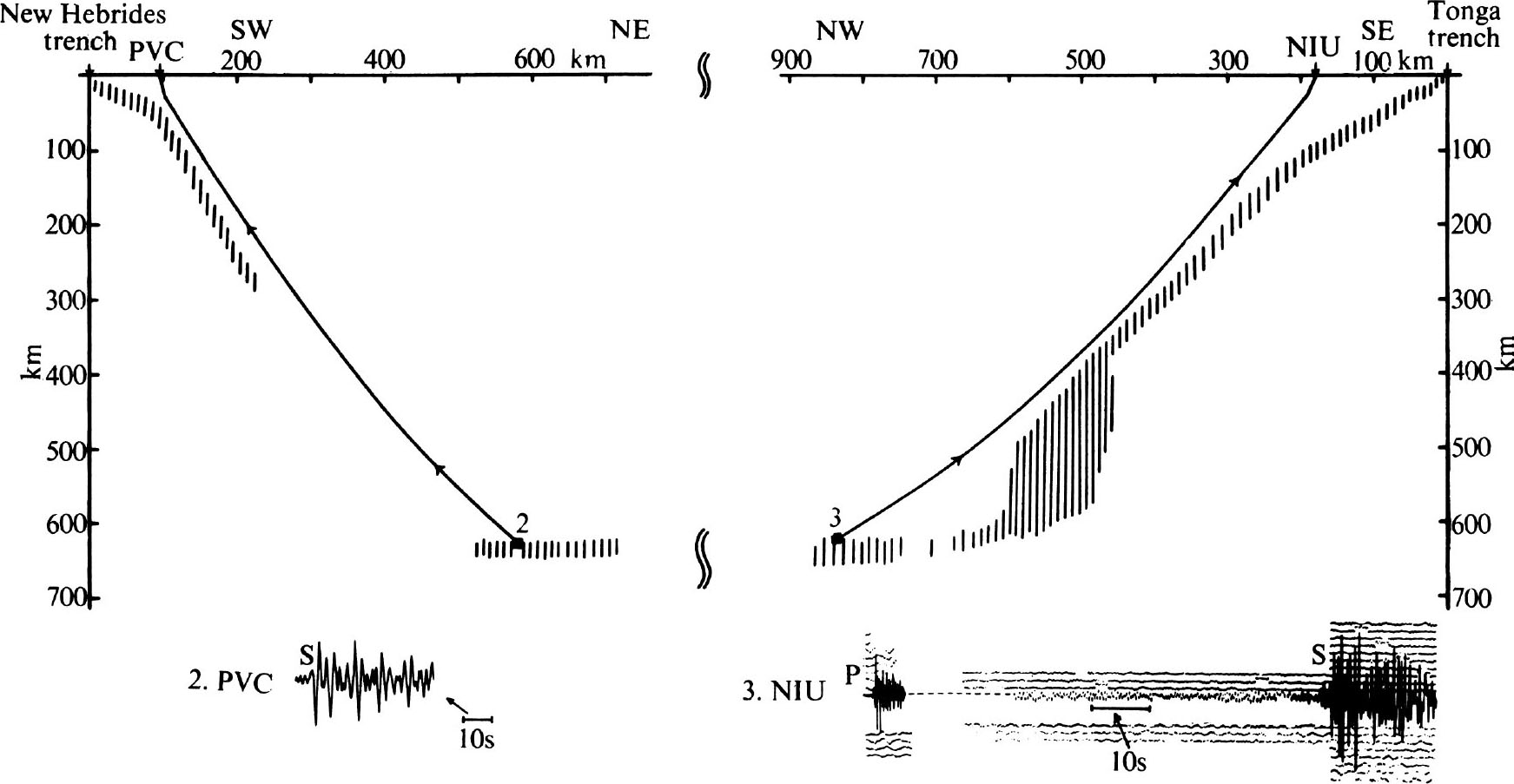 Fig. 3. Two cross-sections of Tonga and New Hebrides arcs showing ray paths to NIU and PVC stations and the corresponding records [E-W component at PVC, and Z component of P, and N-S component of S at NIU] and the locations of seismic activity in the upper mantle (vertical lines). Note the great difference in the signature of S waves at NIU and PVC in spite of the similarity in ray paths (time scale of NIU record is about twice that of PVC).