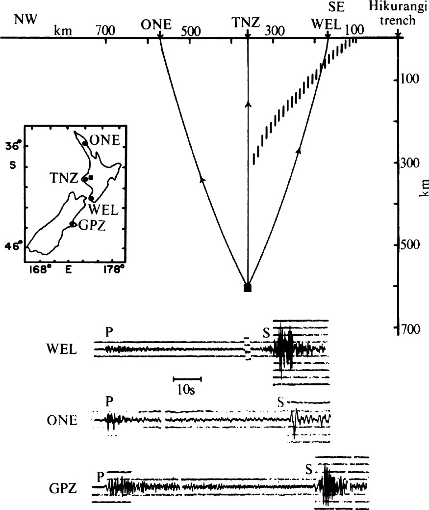Fig. 4. Cross-section of the New Zealand arc showing ray paths to WEL, TNZ and ONE stations, horizontal records to WEL, ONE and GPZ stations, and the dipping seismic zone beneath the North Island (vertical lines). Insert map shows the locations of stations (●) and the location of the deep earthquakes of New Zealand (■).