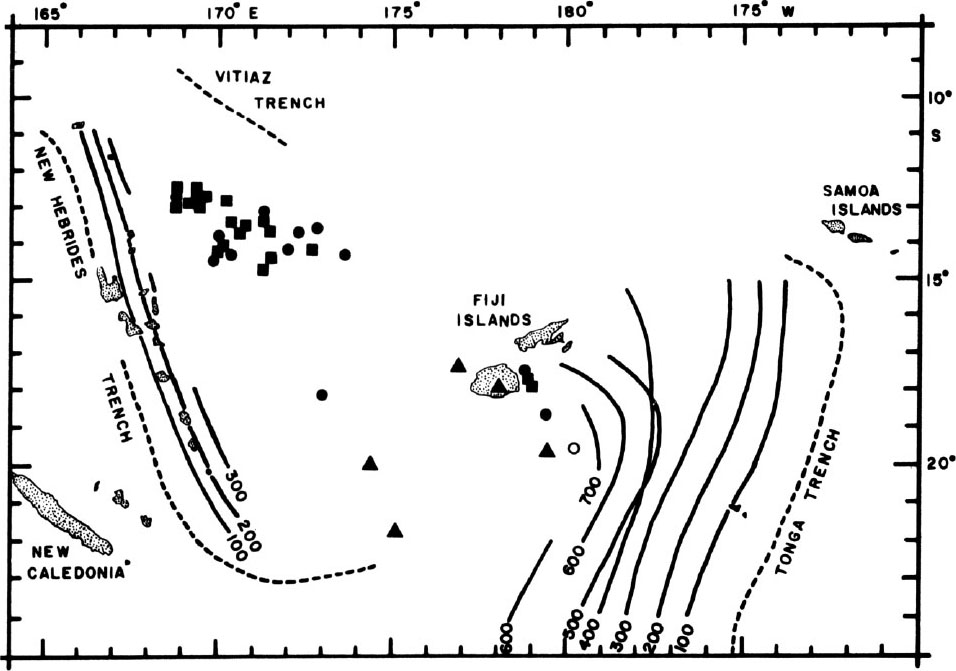 Fig. 5. Map showing contours of earthquake depths for Tonga and New Hebrides arcs, the deep seismic zone of New Hebrides, and well located deep earthquakes beneath the Fiji islands and the Fiji plateau. ▲, Events with depth range between 525 and 575 km; ●, events with 576 to 625 km depth; ■, events with 626 to 675 km depth. The open circle represents an event with a depth of 470 km.