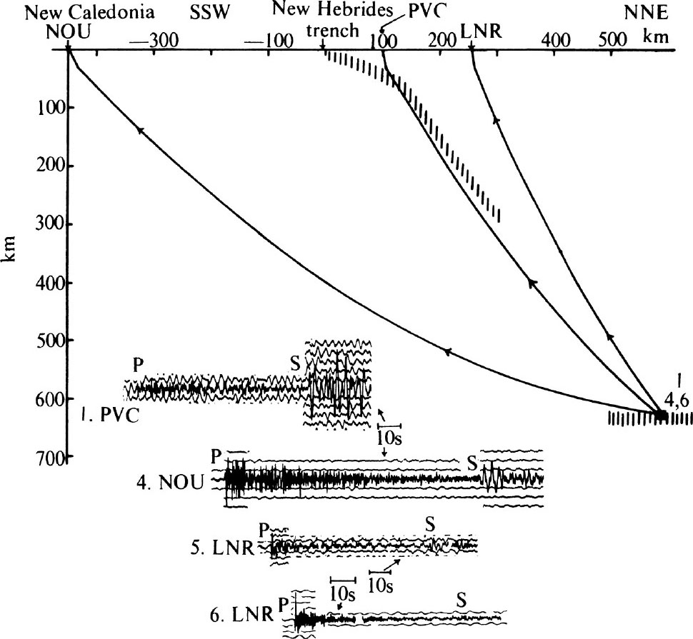 Fig. 2 shows a cross-section through the New Hebrides arc that intersects NOU, LNR and passes close to PVC. New Hebrides deep earthquakes located at the western part of the deep zone (very close to the downward projection of the intermediate depth zone) produce attenuated, low frequency S waves at PVC. The ray paths pass just beneath the dipping seismic zone. Frequencies greater than 1 Hz are absent and the amplitude of the S phase is generally less than that of P phase. As Oliver and Isacks 1 and Barazangi and Isacks 3 show, this can be explained by a transmission through an attenuating low Q zone. In contrast, S waves recorded at NIU station on the Tonga island arc from Tongan deep earthquakes have predominant frequencies of 3-4 Hz and the amplitudes of S are generally larger than those of P. 中文