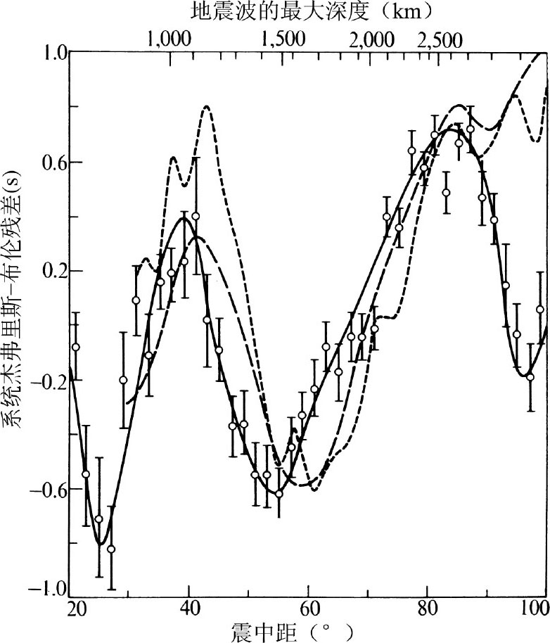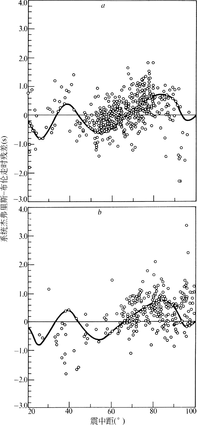 地震体波和表面波的数据早已证明,地球上地幔(深度<700 km)的横向不均匀性是非常突出的。有报告显示,在地幔上部200 km以内纵波速度的横向变化可达10%,而切变波速度的变幅可能更大。然而,在大于700 km的深处很难确定地震波的横向变化,不过还是有一些人 [1,2] 曾引用这种变化来解释某些地震数据的离散现象。在蒙大拿州的大孔径地震台阵测量d T /dΔ的研究中,格林菲尔德和谢泼德 [3] 从实验数据中发现,在西北和东南方向上震中距相差达60°以上,这不能归因于台阵下方的构造,似乎只能用下地幔的不均匀性来解释。戴维斯和谢泼德 [4] 以“阵列图”的形式广泛收集了这类数据。在这幅图中,d T /dΔ和方位角差异表示慢度空间矢量。图中显示出大量的异常,由于这些异常过大,因此不可能是震源区上地幔不均匀效应所致;另一方面,这些异常会随着地震波传播方向的改变而快速变化,表明这与台阵正下方的地质构造没有关系。而且对于由地核引起的压缩波衍射的研究进一步验证了上述观点,亚历山大和菲尼 [5] 发现,位于太平洋海盆下方的核幔边界区和位于北大西洋及非洲下方的核幔边界区迥然不同。 英文