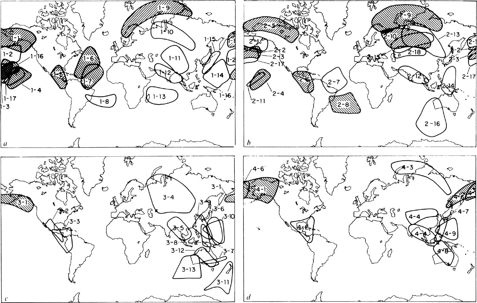 图4. 探及地幔底界的P波传播路径分区图。斜线部分表示与全部数据的平均值显著不同的区域。检测的其他区域以轮廓线表示。图中的识别编码与表1和图3的编码对应