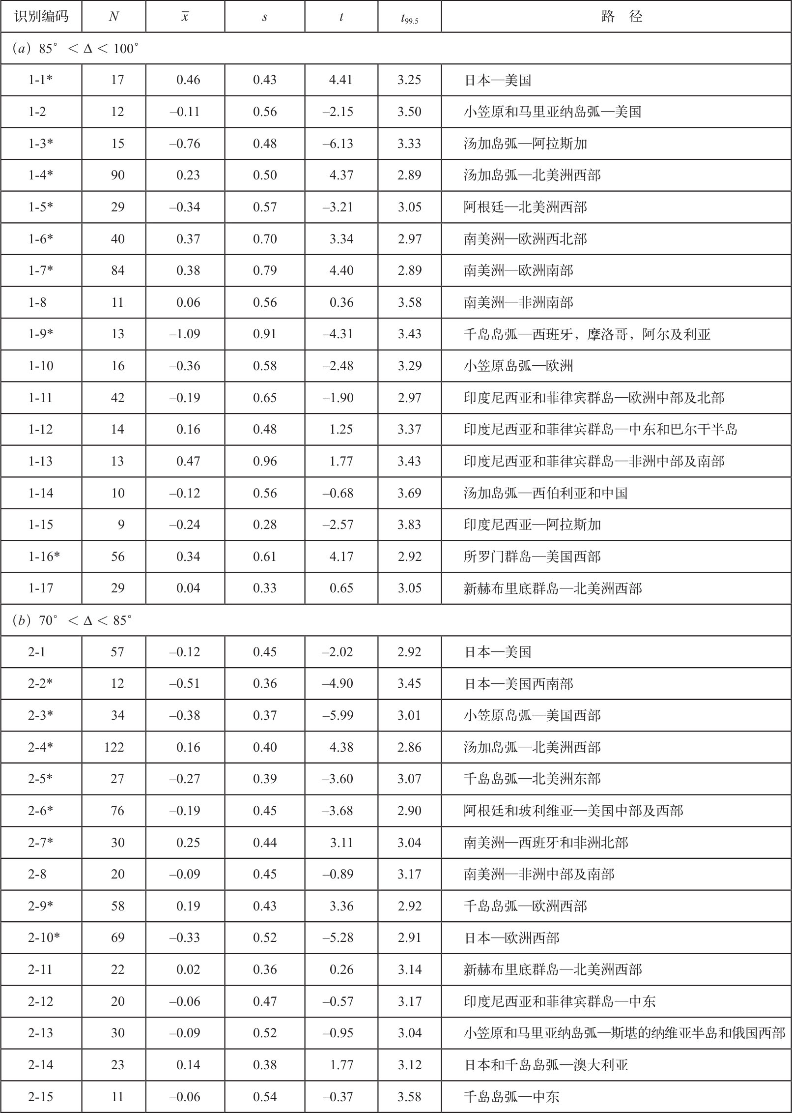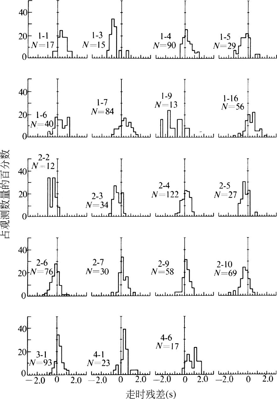 图3. 地震波沿不同路径穿过地幔的走时残差直方图(残差是相对于图1的曲线,且经过台站校正)。识别编码与表1和图4上的编码对应。 N 是观测到的地震数量。