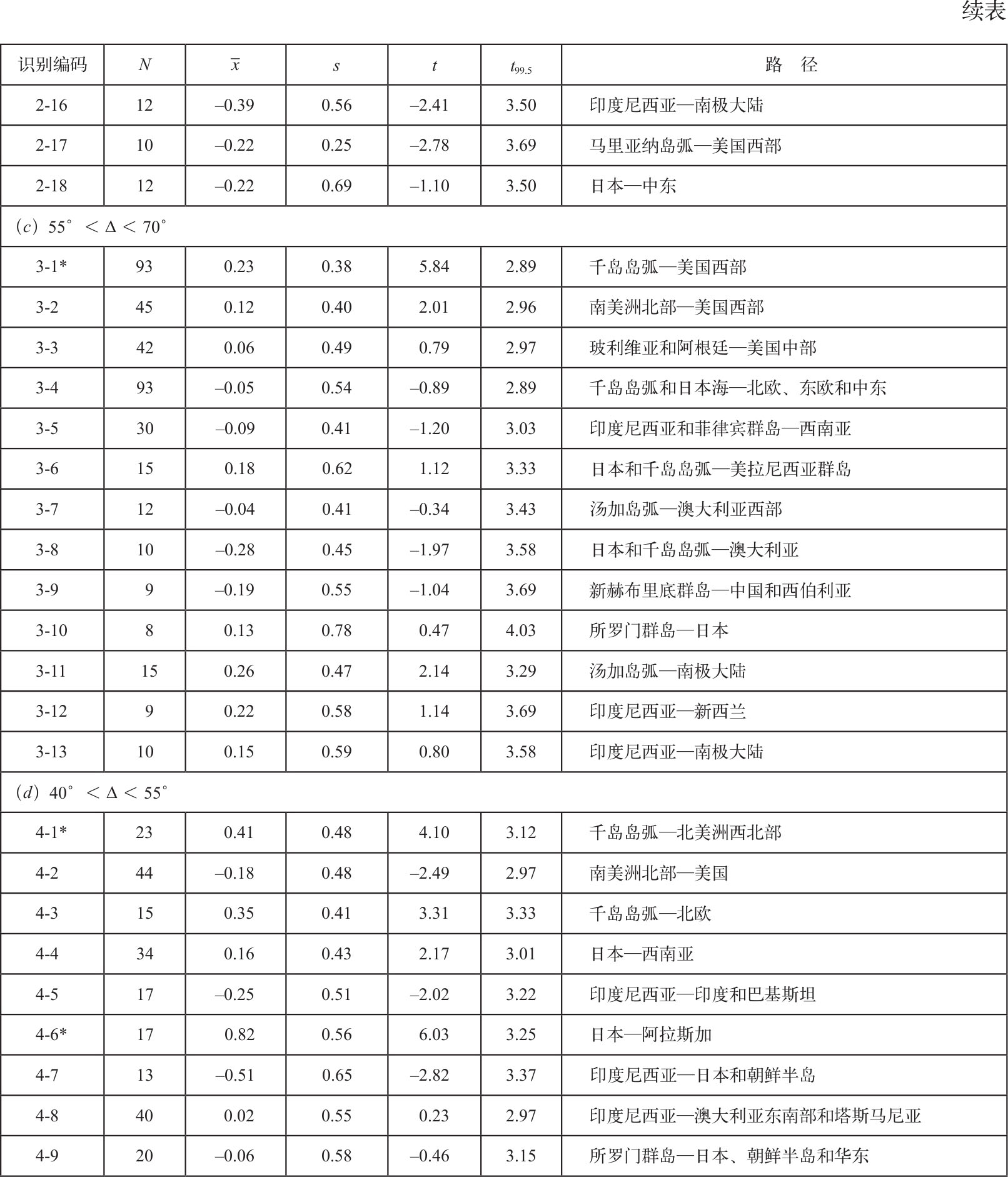 表1中的平均走时数据表明对于能底及2,600 km以下的射线而言,变化量约为1.5 s,而对于能底及2,000至2,600 km之间的射线来说,变化量约为0.6 s。虽然这些数据有些不确定,但是真实的走时很可能至少有1 s的变化量。地幔中实际传播速度的变化值取决于产生速度变化的区域的大小。图4中的数据显示,某些异常的尺度至少可达1,000 km或稍小,在这种情况下,传播速度至少要有1%的变化。这是一个下限,因为我们可能高估了非均质体的规模,也因为我们是在相当大的区域里测量速度平均值,很可能存在一些正负速度异常的相消效应。把有关走时的解译和d T /dΔ测量值结合起来有助于提高地幔结构细节的分辨率。 英文
