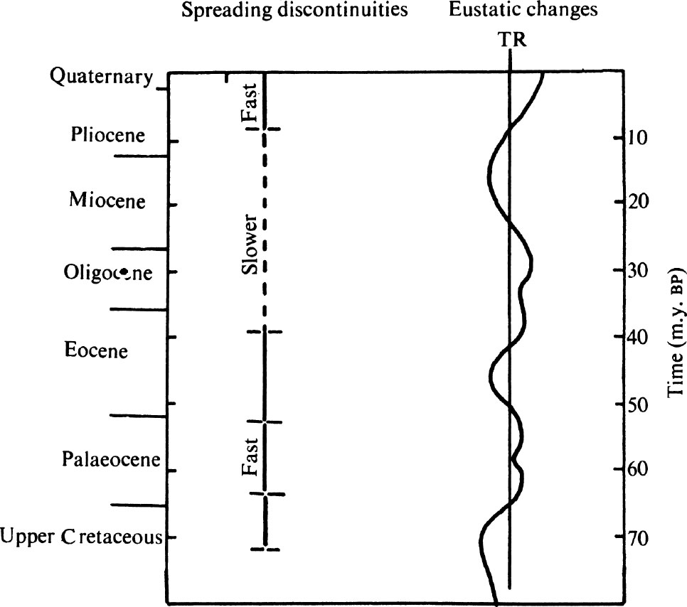 Fig. 5. Correlation between generalized global discontinuities in spreading and generalized global eustatic change (from Fig. 4). The eustatic change is necessarily approximate because of the limitations of the data.