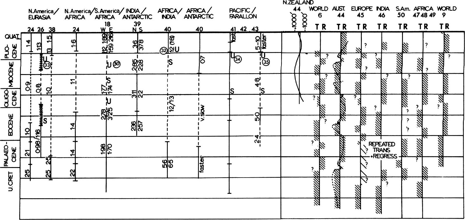 To check that this correlation does not reflect only the vertical movement of a particular plate, we have examined the Late Cretaceous and Cainozoic spreading histories of the major plates 25 for a global relationship. Global discontinuities in spreading have been postulated 23,25-28 ; our comparison (Fig. 4) shows a global deceleration in spreading at about 45 m.y., an acceleration at 10 m.y., and other discontinuities between 55 and 60 m.y. and about 70 m.y. Comparison of the ages of these discontinuities and eustatic changes documented on continental margins (Fig. 4 and Fig. 5) shows (within the limitations of the data) that the Oligocene-Miocene spreading deceleration is associated with a regression preceded by a minor transgression. The Late Miocene transgression just precedes the 10 m.y. acceleration and a transgressive-regressive phase may correlate with the 60 m.y. discontinuity. We therefore suggest that eustatic changes are connected with contemporaneous global spreading discontinuities and that older transgressions such as the Cenomanian will probably be associated with similar discontinuities. 中文