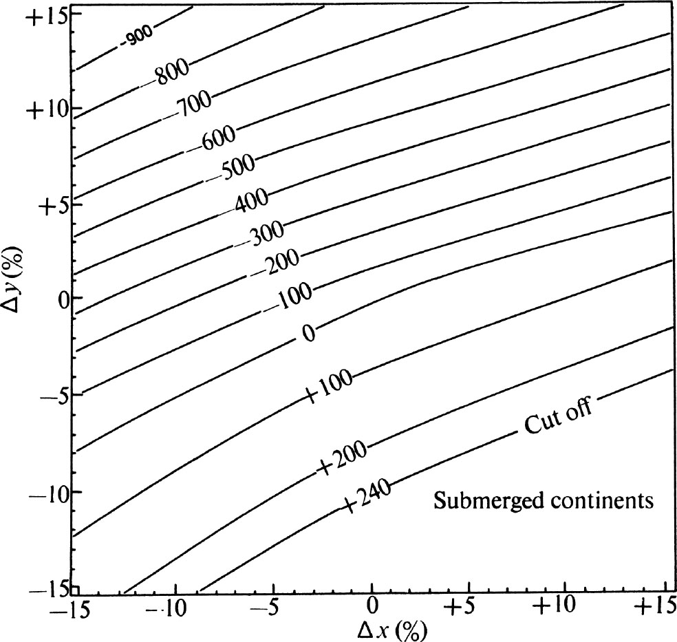 Fig. 2. Eustatic changes of sea level (m) relative to present sea level, contoured in terms of % change in continental area, x , and % change in ocean depth, y . For a rise of 240 m all continents are submerged.