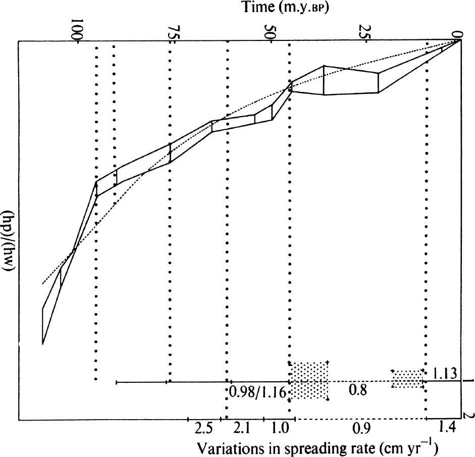 A relationship between mid-ocean ridge elevation changes and eustatic changes has been suggested 3-13 and the relationship between ridge elevation and spreading rate 29 has been supported by statistical evidence 20 showing that ridges spreading slower than 3 cm yr –1 tend to be higher than faster ones. Decelerations in spreading should therefore be accompanied by uplift and accelerations by subsidence. But deep-sea drilling data 30 and spreading rates 18 for the southern Mid-Atlantic Ridge show the converse; the post 38 m.y. deceleration was followed by uplift in the Late Oligocene and subsidence in the Early Miocene; the ridge was uplifted to near its present elevation just before the 10 m.y. acceleration. Although these elevation changes correlate well with eustatic changes, the differences between the observed data and empirical model suggest that, at the slow (1.12 to 1.74 cm yr –1 ) spreading rates on this ridge 18 , effects such as phase changes 31 may also contribute to elevation changes. Other deep-sea drilling data 32-35 can also be interpreted to support uplift and subsidence accompanying spreading rate changes. The transgressive-regressive sequence may be due to elevation changes during the adjustment period observed at some discontinuities 26 . 中文