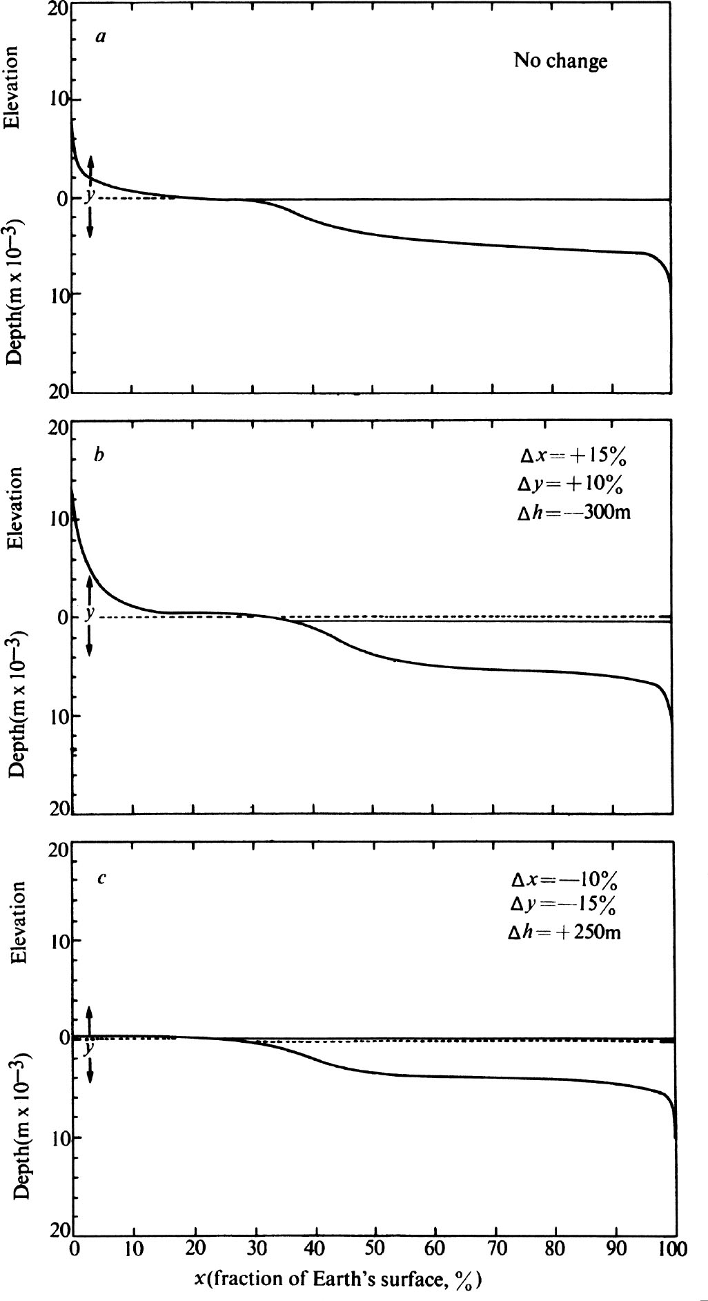 Fig. 1. a , The present hypsographic curve for the Earth 16,17 . b , Hypothetical hypsographic curve after increasing continental area at present sea level by 15% and increasing ocean depth by 10%. Note increased height of continents, and decrease of sea level by 300 m. c , Hypsographic curve resulting from decreasing continental area at present sea level by 10% and decreasing ocean depth by 15%. Although continents are not reduced below present sea level, the eustatic rise in sea level results in total inundation.