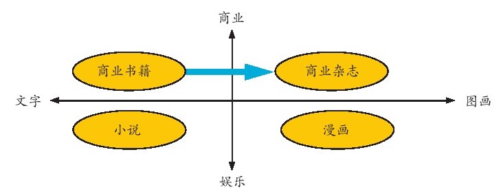 下图就是参数型矩阵的一个案例。4个箭头分别代表了文字、图画、商业、娱乐四种特性,箭头两端具有一定的相对性。在图解的右边,强调图画多文字少,比如漫画和商业杂志;在图解的上方,强调商业因素多,娱乐因素少,比如商业书籍和商业杂志。数据显示目前单行本的商业书籍不受欢迎,销量呈下降趋势,相对应的文字较少、图画较多的商业杂志卖得很好。由此可知,应该把商业书籍杂志化,在书中增加一些有吸引力的图片。图解中由商业书籍引向商业杂志的箭头就是这个含义。
