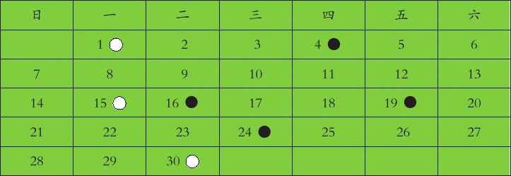检查型矩阵非常实用,可以根据需要变化出多种方便又实用的图解模式。比如,下图是某月的日历,你准备对这个月的工作情况做一个检查,没有完成任务的那些天用〇表示,按时完成任务的那些天不加任何符号,超额完成任务的那些天用●表示。你还可以由表格快速掌握自己的工作信息:4天超额完成任务,3天没有完成任务,其中2天是周一,这是不是说明你不能很快地从周末的休息状态过渡到工作状态呢?